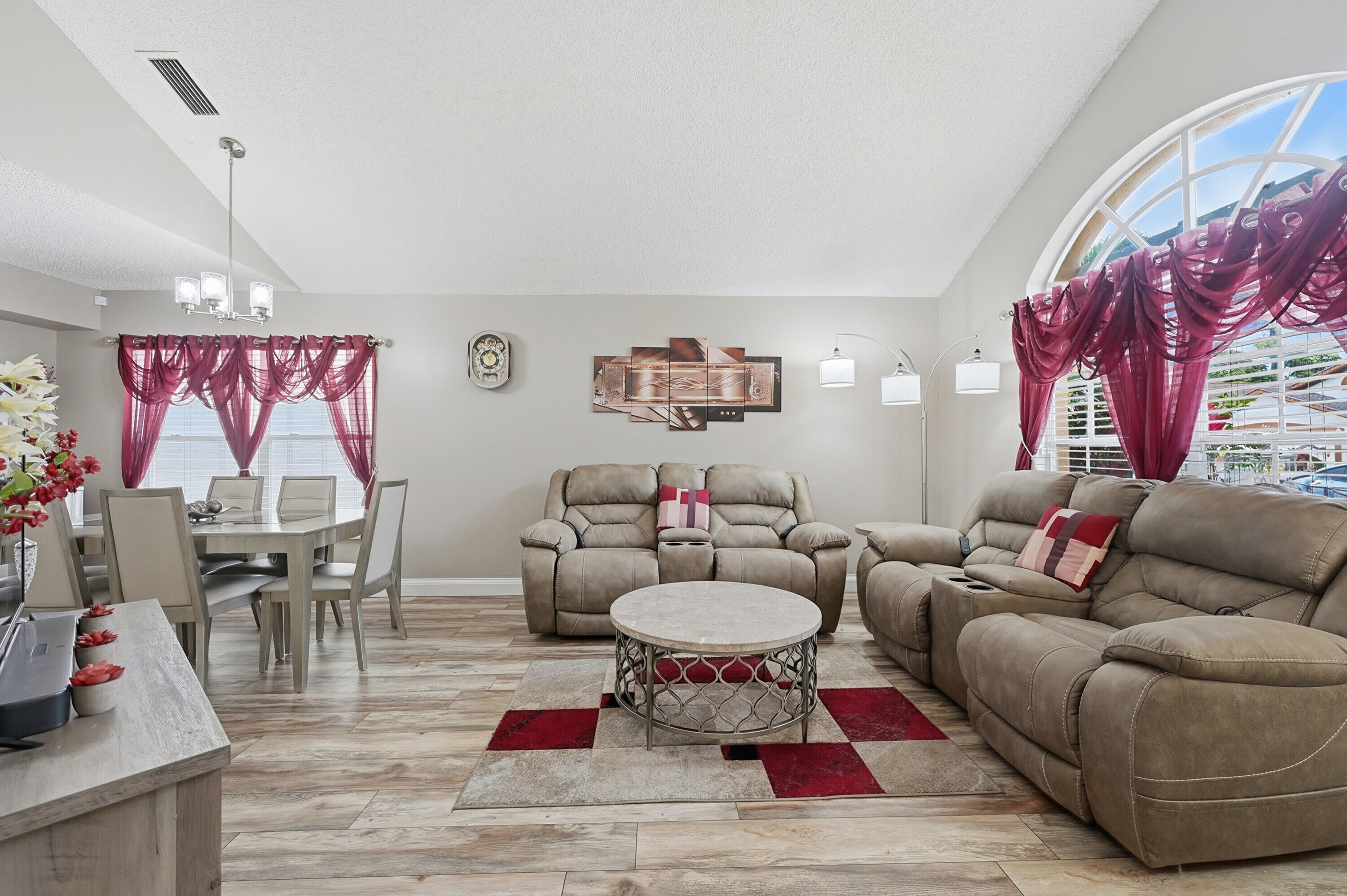 Beautifully updated throughout and move in ready! Show stopper kitchen with granite and stainless, luxury wood laminate or tile in every room. Roof is 2024 and all newer appliances. Garage has been partially finished to offer 2 bonus rooms on main level. Luxury owner's suite with jacuzzi bath. Enjoy sunsets and all year outdoor living on your screened oversized patio with waterfront and fountain view. Large fenced rear yard, formal living and dining room plus generous family room off of eat in kitchen. Just move right in it's all been done for you!