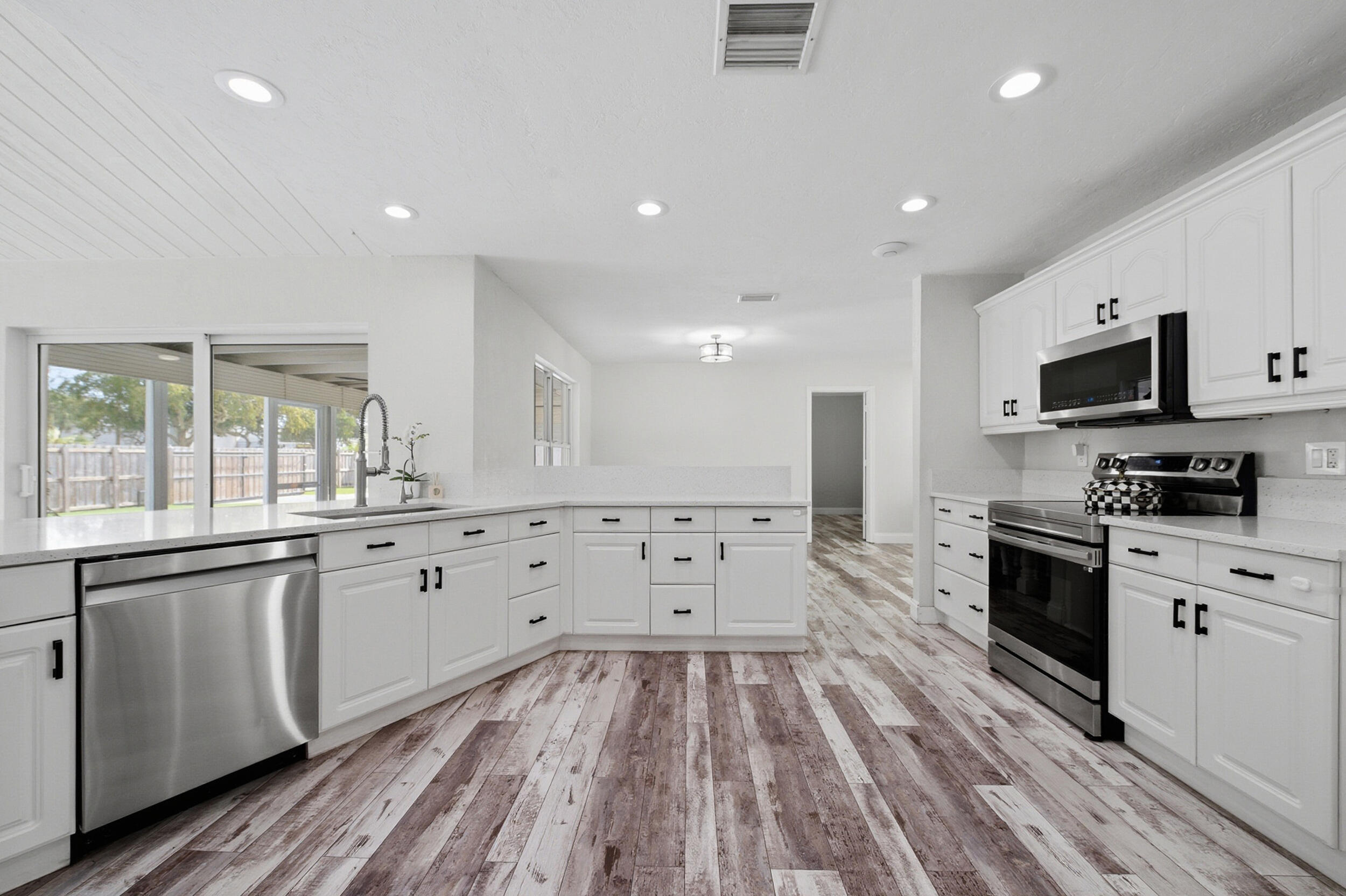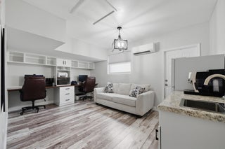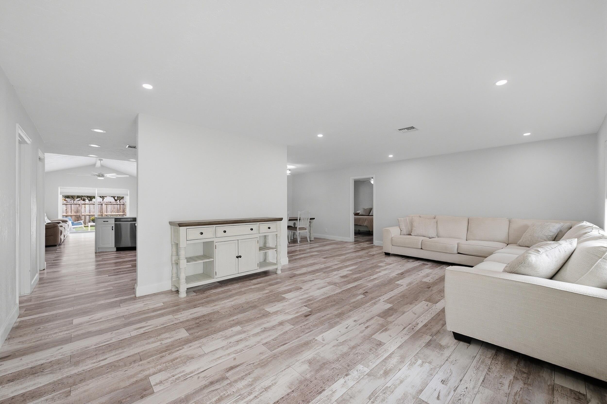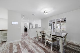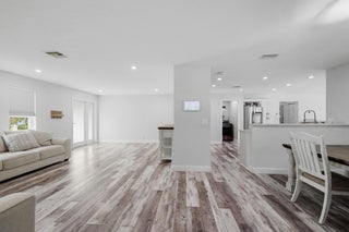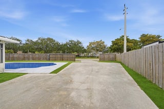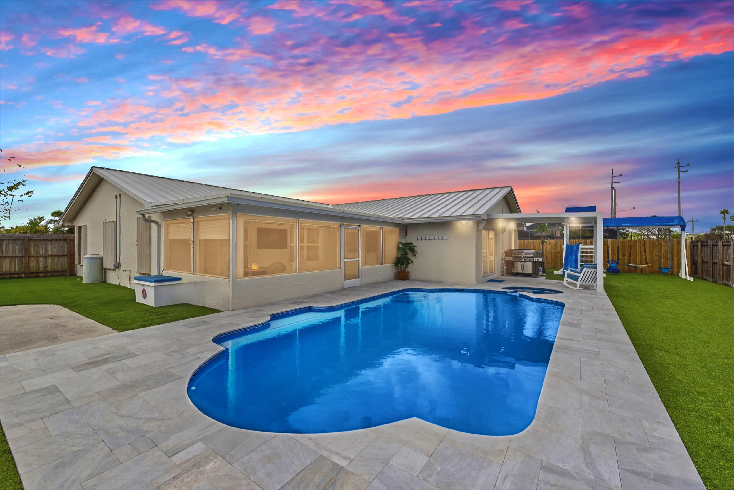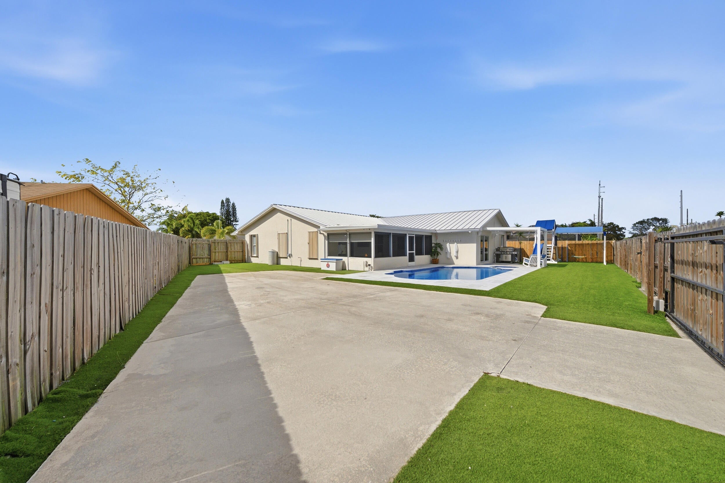 Stunning NO HOA corner lot home loaded with upgrades! Standing seam metal roof and new insulation 2024. Impact windows/ doors 2023. Updated electrical panel. 80 gal commercial WH 2023. Generator transfer switch for whole house. Backyard oasis with saltwater pool and spa with heater/chiller, RGB lighting, Azure blue resurface and Jandy equipment 2023, sandblasted marble deck, turf yard, outdoor shower, custom aluminum pergola with lighting. Screened 300 sf patio with roll down hurricane shutters. Electric 20 foot rear gate with remote, paved rear drive, 1250 sf slab, 30 amp RV hookup. Smart appliances 2024, Wi-Fi thermostat. Ethernet wired with IT rack, wired outdoor speakers, hardwired 4K cameras. Garage converted bonus suite with kitchenette, full bath, private entrance and AC.