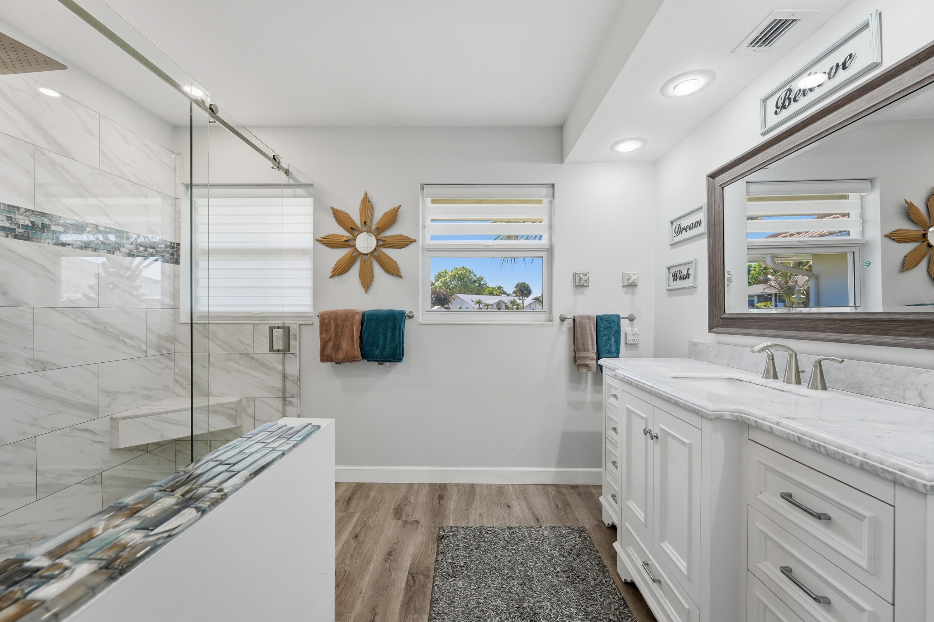 Located on a quiet cul-de-sac, this 3-bedroom, 3-bath home sits on a spacious .62-acre lot and offers extensive upgrades throughout. Key highlights include impact-rated doors and windows, an updated primary bathroom, removed popcorn ceilings, new baseboards, LED lighting, ceiling fans, and a tankless-style water heater for the bedroom baths. The true two-car garage features added lighting, cabinetry, attic access, and flexibility for future expansion.Outdoor living shines with a covered patio (2025), new decking with LED lighting, a screened pool with upgraded pump, filter, plumbing, and high-efficiency electric heater, plus hurricane shutters for the updated French doors. Additional features include an approx. 84' paver driveway with RV parking, extra 50 amps for RV hook up, permittedstorage shed, improved drainage, solar attic fan, Ring camera system, mature landscaping, and a recent Florida wind mitigation inspection. Call agent to schedule. PLEASE DO NOT DISTURB OWNERS.
