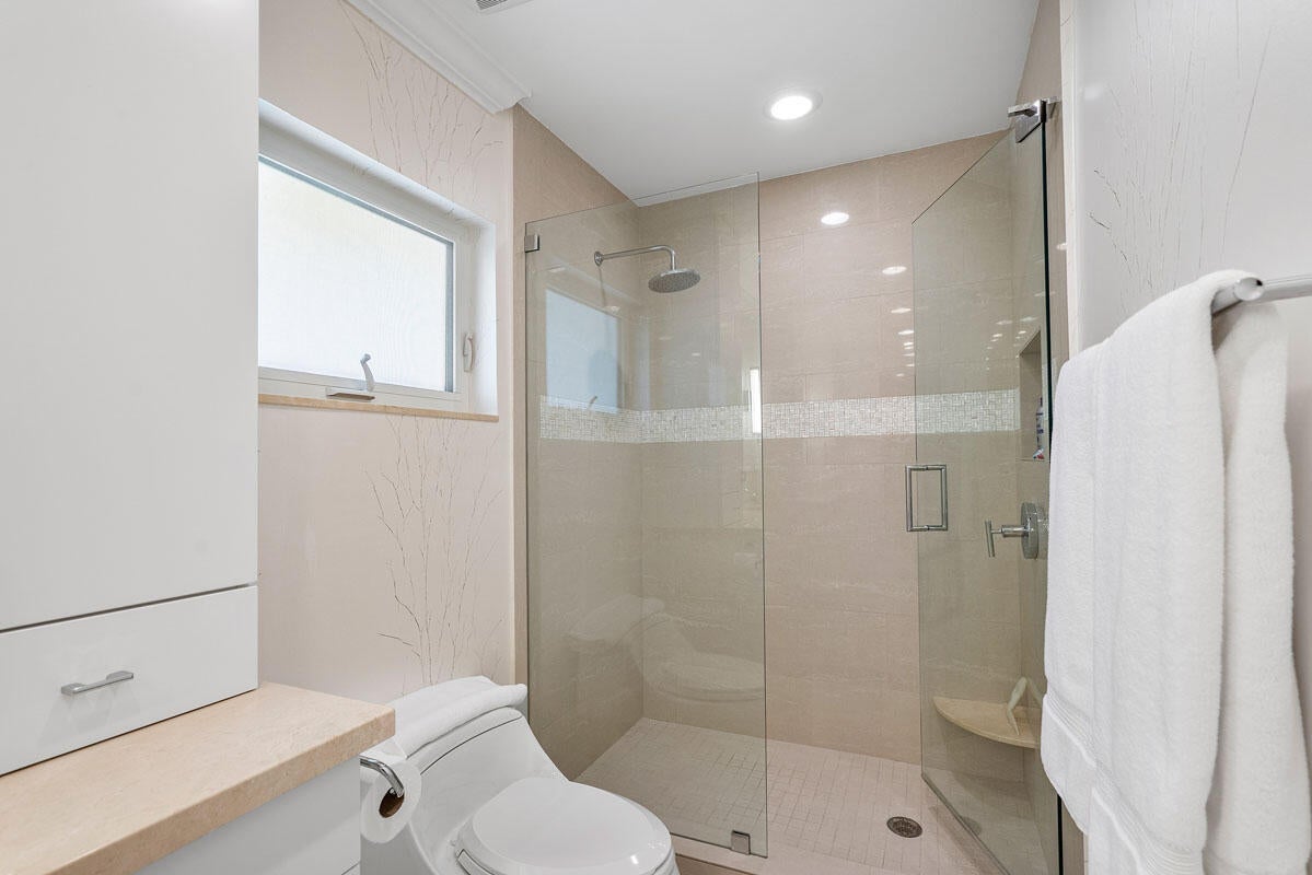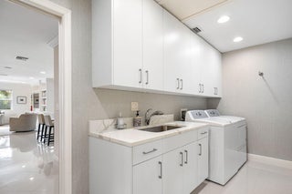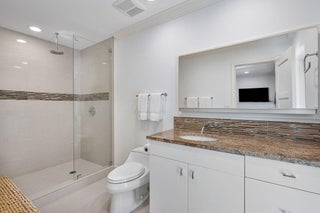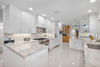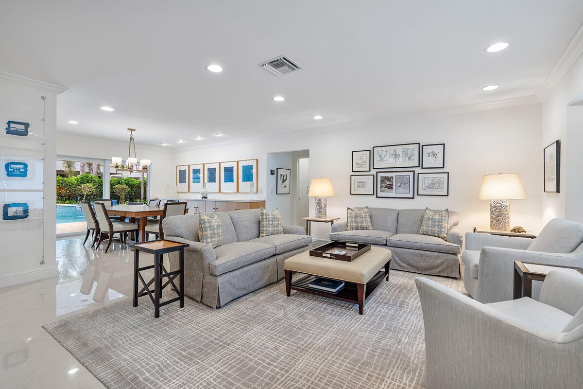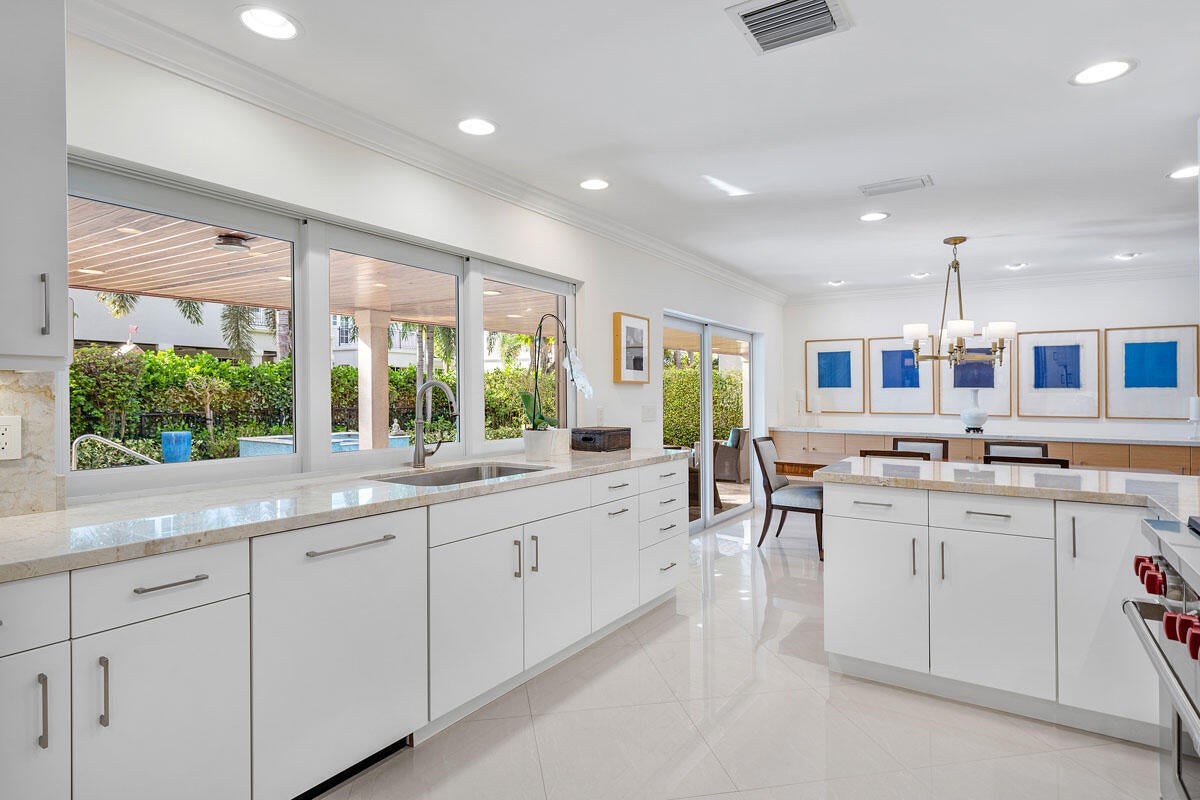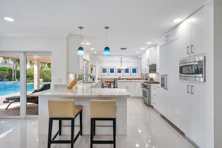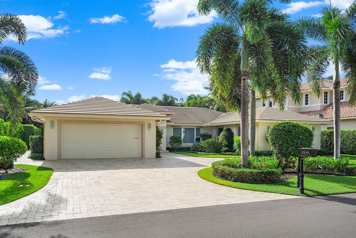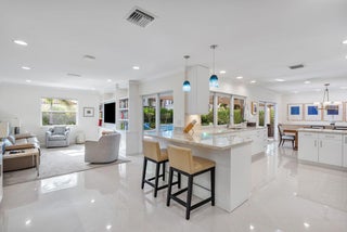 1810 Sabal Palm Drive is a renovated three-bedroom plus den single-story residence situated on a quiet street within Boca Raton's premier community, Royal Palm Yacht & Country Club. A covered entry opens to a welcoming foyer with polished porcelain floors and a light, bright split floor plan. Impact windows and doors provide abundant natural light and highlight views of the private backyard. The gourmet kitchen features two peninsulas, Wolf and Thermador appliances, premium marble countertops, and a snack bar, and flows seamlessly into the family room for easy entertaining. A spacious dining room with floating cabinetry and poolside views offers an ideal setting for more formal gatherings.The primary suite is open and generously sized, with a large sitting area suitable for an office or exercise space. The backyard serves as a private retreat, surrounded by a lush privacy hedge and featuring a covered patio, a heated pool and spa with a cascading water feature, and a travertine deck. Additional features include electric window treatments, a natural gas generator, an electric vehicle charging station, and recessed LED lighting throughout.
