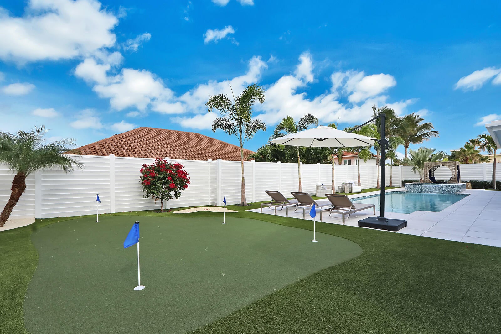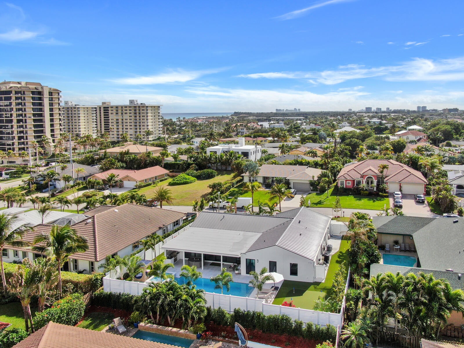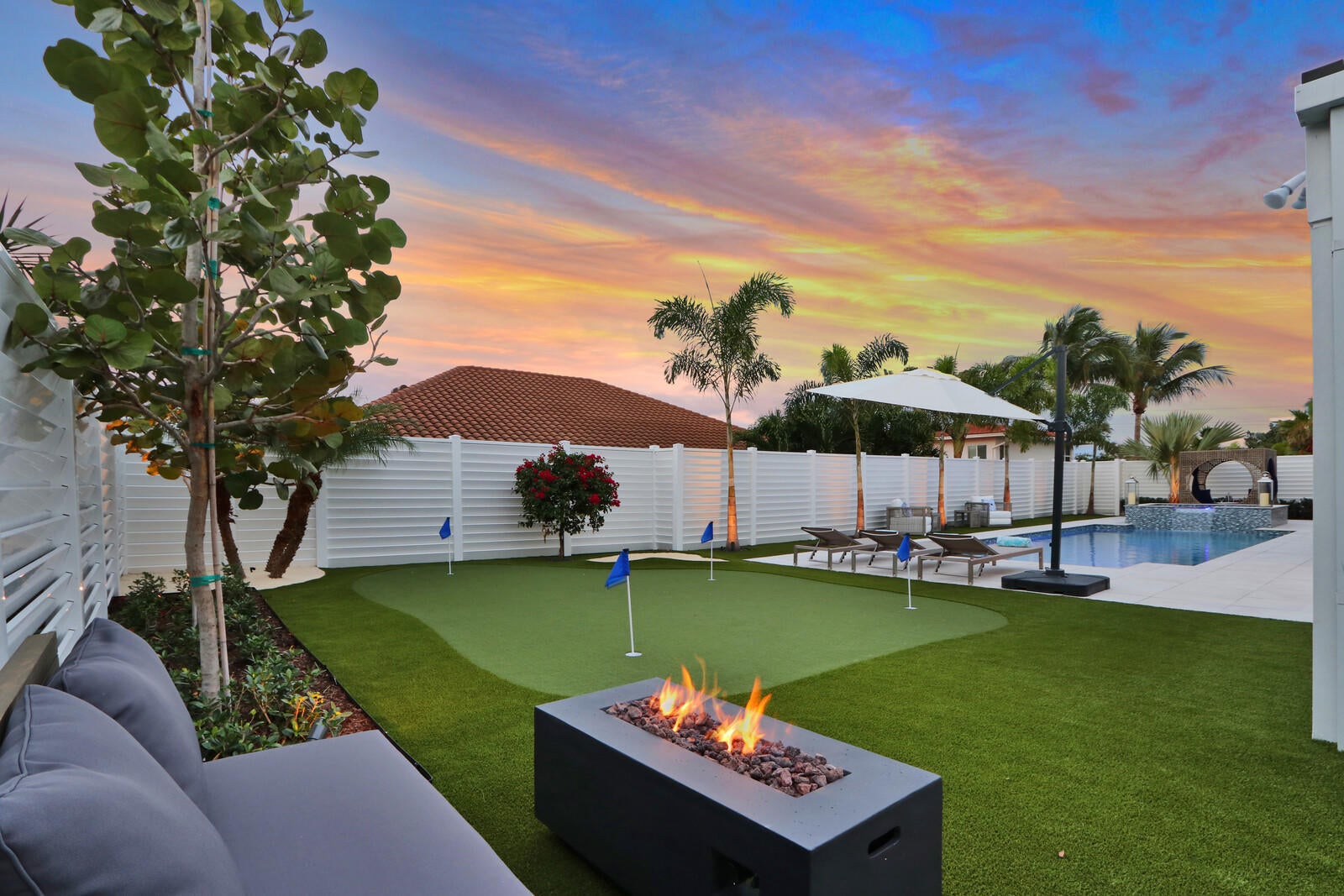 Welcome to your seaside retreat. Enjoy this professionally designed and decorated beachside paradise bringing the Northwest feel to the Juno seaside,.There is not a detail missed in this luxurious home.Sleeps 14, dining for 20. Restoration Hardware inspired decor throughout including furnishings, Italian imported porcelain concrete look flooring, and kitchen and bath appointments.The spacious and bright double living area is conducive to large gatherings featuring a double sided fireplace, entry wet bar and two separate bar top dining areas.. Entertainment room with 86'' tv and foosball table opens out into the fabulous covered outdoor living space. Kitchen features Thermadore Integrated appliances, quartz counter tops, ample custom cabinetry,printer/charger bar work station,built-in ovenand microwave and appliance pantry. Oversized master bedroom complete with walk in closet features black out window dressings for your perfect nights sleep and top of the line king size mattress. Awesome spa-like master bath has a glass enclosed wet room with soaking tub and rain shower with Kohler fixtures surrounded by special soft lighting. Enjoy the breezes off the Atlantic in your zen-like back yard with indoor/outdoor living areas complete with built in barbeque. Privacy is assured with clean white fencing surrounding palm tree lined tropically landscaped heated swimming pool and waterfall jacuzzi ,fire pit relaxation area and birds nest cabana, PUTTERS DREAM WITH 15X20 PUTTING GREEN DESIGNED WITH THE PROFESSIONAL GOLFER.IN MIND. You will be happy to come home to this hilltop get away with an ocean view at your front door. Don't miss out! Reserve today. Six month minimum for 2026-2027 season. Off season and annual rates available.