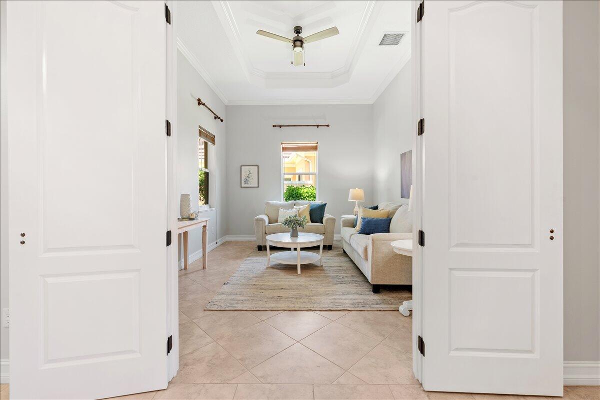 Wake up to the serene beauty of calming lake views shimmering through your windows. Imagine your mornings begin on the private patio, coffee in hand, enveloped by the quiet elegance of this sanctuary. Where every day feels like luxury is built into your daily rhythm. Inside your 2722 sqft home, volume ceilings and top-tier finishes create an airy, sophisticated retreat. Whether you're hosting in the formal dining room or finding focus in your private office, every corner feels finished and pristine. As evening falls, pour a glass of wine and watch the sunset over the water before heading out. You're minutes from the Restaurants, elite Country Clubs, and the Riverside Theatre. With a luxury clubhouse, pool, & fitness center at your fingertips, this isn't just a home--it's your private oasis