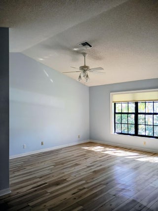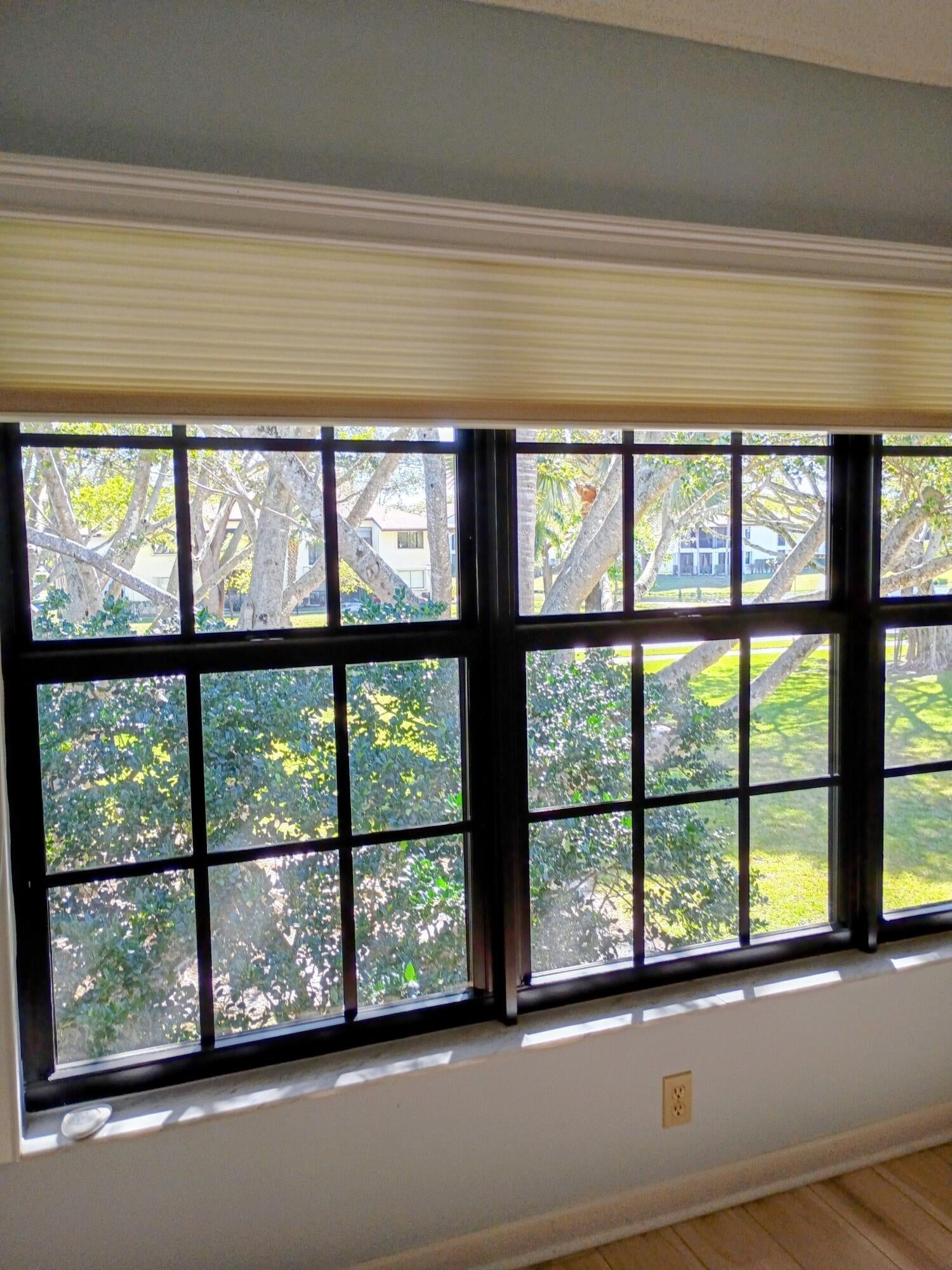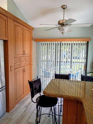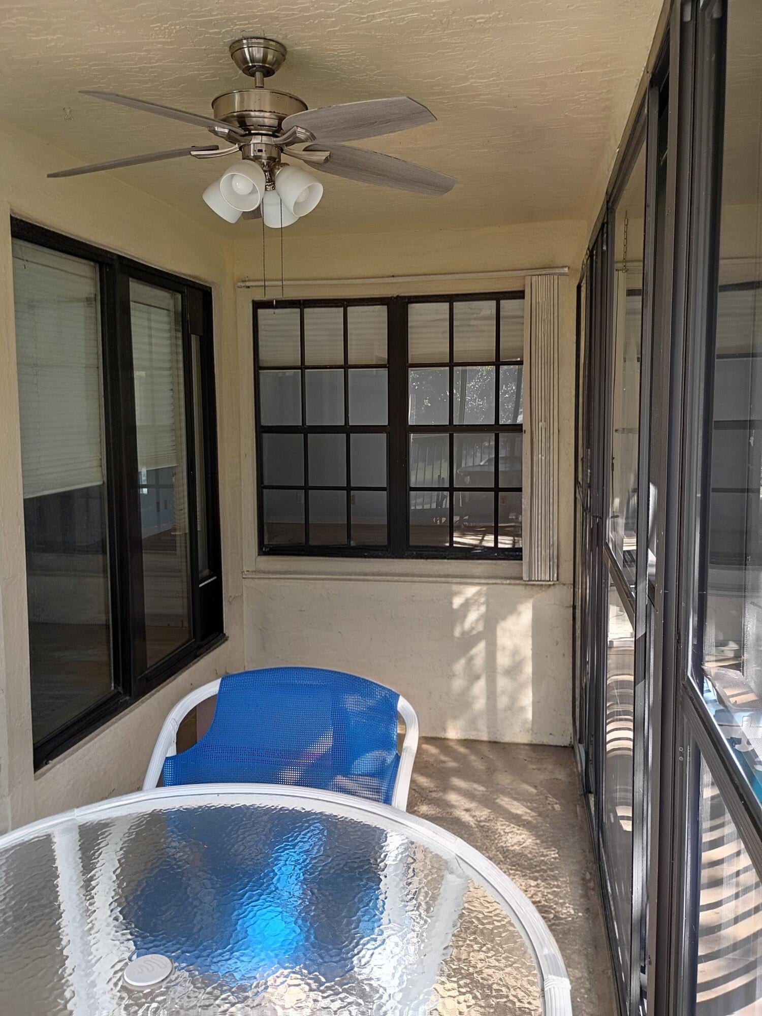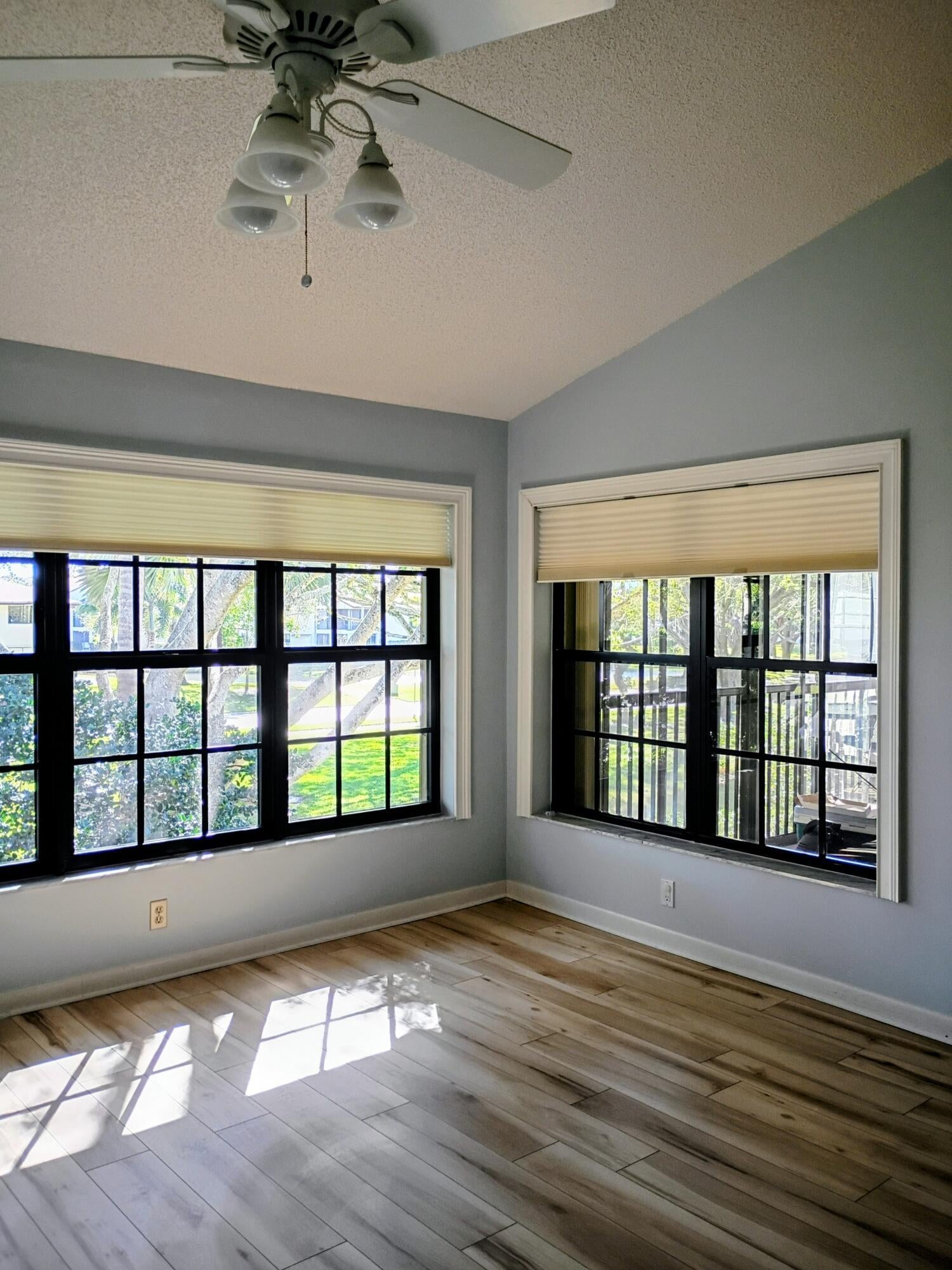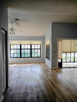 Beautifully updated and bright with a great water view! Cathedral ceilings give this condo a spacious and airy feeling. The kitchen is wonderfully done with granite counter tops, stainless steel appliances, loads of custom wood cabinetry, new cooktop, uplighting and sliding glass doors leading to porch. Porch is fully screened with vinyl sliders and tile flooring. There are impact windows in the living room with electric Hunter Douglas shades, accordian shutters protect the remaining windows, ceiling fans throughout. Luxury vinyl plank flooring was installed 2 years ago in the main living areas plus 1bedroom which can also be used as an office and brand new carpet in two of the bedrooms. The master bedroom has double sinks with corian tops, walk-in closet and walk-in shower.Guest bathroom has custom sink with combination tub and shower. There is a community clubhouse with pool, shuffleboard, billiards, tennis courts, fitness center and more. This condo is sure to please!