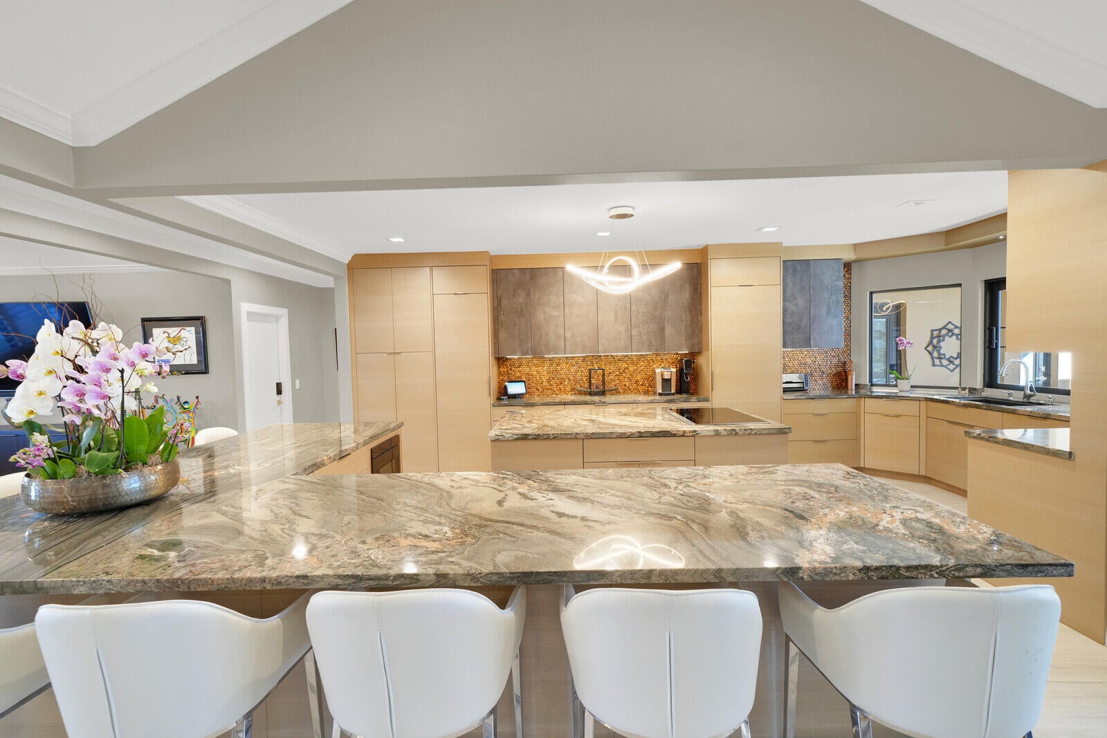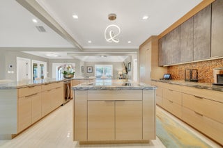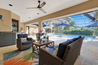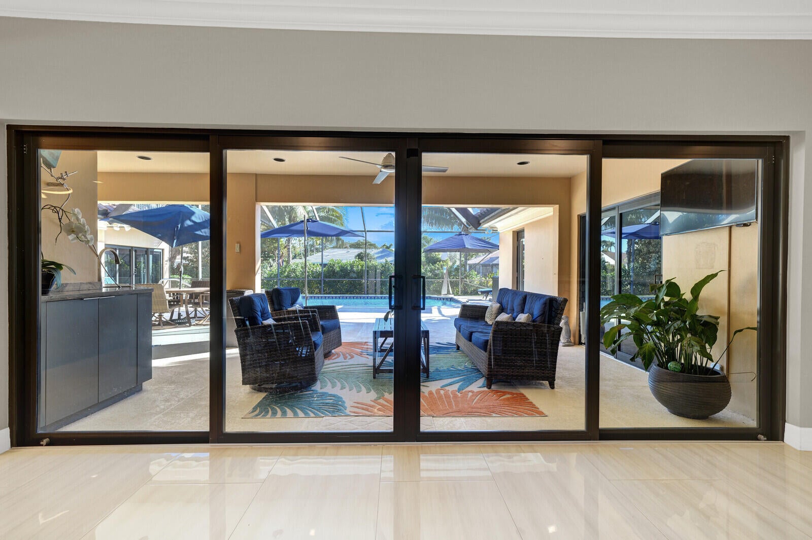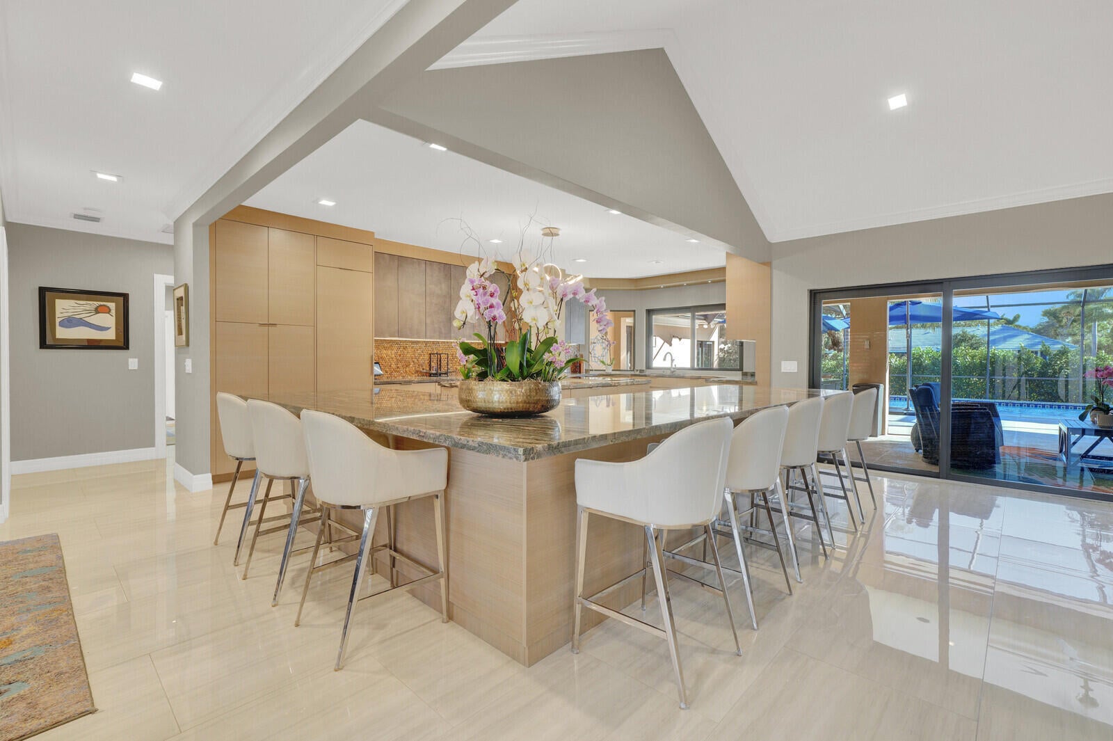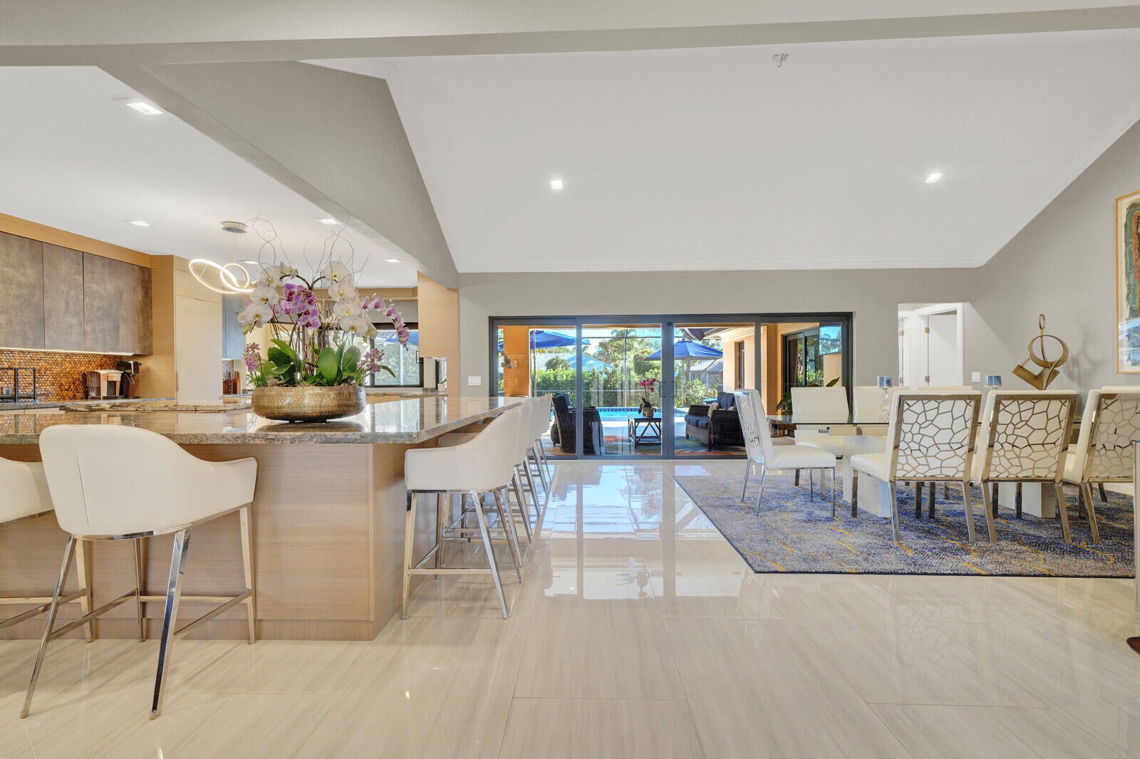 Exceptional pool home with a private guest house in the City of Atlantis, offering a rare blend of privacy, flexibility, and thoughtful design. Situated on an approximately 0.38-acre canal-front lot, this distinctive property features a 3-bedroom, 3 full and 2 half bath main residence with 3,187 square feet under air, along with a two-story guest house offering 2 bedrooms, 1 full bath, and 1,092 square feet under air, for a total living area of 4,279 square feet. The layout is ideal for multigenerational living, extended guests, or a private retreat that is seamlessly connected yet easily independent.Both the main home and guest house are oriented toward the screen-enclosed pool and covered patio, creating an effortless indoor-outdoor lifestyle. A lush Calusia hedge providesexceptional privacy, while the canal setting offers a tranquil backdrop. Curb appeal is enhanced by a circular driveway and covered front entry, with an additional side driveway leading to a discreetly positioned 2.5-car garage tucked out of view from the street. The expanded garage includes a two-car bay, dedicated golf cart storage with interior access, built-in cabinetry, and additional storage space. The main residence features a split floor plan offering privacy and flexibility, including one ensuite guest bedroom and a second guest bedroom accessed by a private hallway that can be enclosed for a suite-style configuration. Vaulted and volume ceilings are found throughout, including approximately 15-foot ceilings in the dining room and 14-foot tray ceilings in the family room, primary suite, and bonus room. The bonus room provides versatile space for an office, gym, or den. Main living areas feature oversized ceramic tile flooring, while bedrooms are finished with luxury vinyl plank. Crown molding, baseboards, and plantation shutters enhance the interior, and impact windows and sliding glass doors are installed throughout the main home and guest house, with the exception of glass block in the primary bathroom. The custom-designed kitchen serves as the heart of the home, offering a seamless aesthetic with fully integrated appliances and custom wood cabinetry with soft-close doors and drawers. Highlights include a central island with induction cooktop, a Samsung smart oven with gourmet self-cook options, a fully paneled Dacor refrigerator and freezer, dual-zone wine and beverage refrigerator, and an expansive snack bar with seating for eight or more. Exceptionally planned storage includes spice drawers, dedicated cookware and sheet pan drawers, and a pantry. A pass-through window connects the kitchen to the covered patio and summer kitchen, enhancing entertaining. Matching cabinetry continues into the foyer powder room for a cohesive design. The primary suite features a 14-foot tray ceiling, direct access to the covered patio, and a spacious bathroom with dual vanities, a separate shower, and a soaking tub. Additional interior features include a large laundry room with utility sink, abundant storage, exterior access, and recently added Philips smart locks on multiple doors. The two-story guest house offers a private exterior entrance with smart lock and optional interior access from the pool area. The first floor includes a kitchenette, dining area, and family room, while the second floor features two bedrooms and a full bathroom. Luxury vinyl plank flooring runs throughout, with carpeted stairs only. One bedroom enjoys a private balcony overlooking the pool and canal, and impact windows and sliders are installed throughout. Outdoor living is highlighted by a screen-enclosed pool with covered patio, outdoor shower, and a true cabana bath accessible directly from the pool deck. Additional usable yard space exists beyond the screened enclosure, and a natural gas line remains in place for a future pool heater and other appliances as desired. The home is equipped with extensive systems and smart features, including three air conditioning systems with Ecobee smart thermostats, three water heaters including two tankless units, a whole-house generator with load-shedding switches, central vacuum system, whole-house gutters, and natural gas service. Located within the fully gated City of Atlantis, residents enjoy three manned guard gates, an independent police department, two golf courses, and a vibrant calendar of community events. This rare offering combines privacy, versatility, and modern systems in a thoughtfully designed layout, delivering exceptional indoor-outdoor living in one of Palm Beach County's most distinctive communities.
