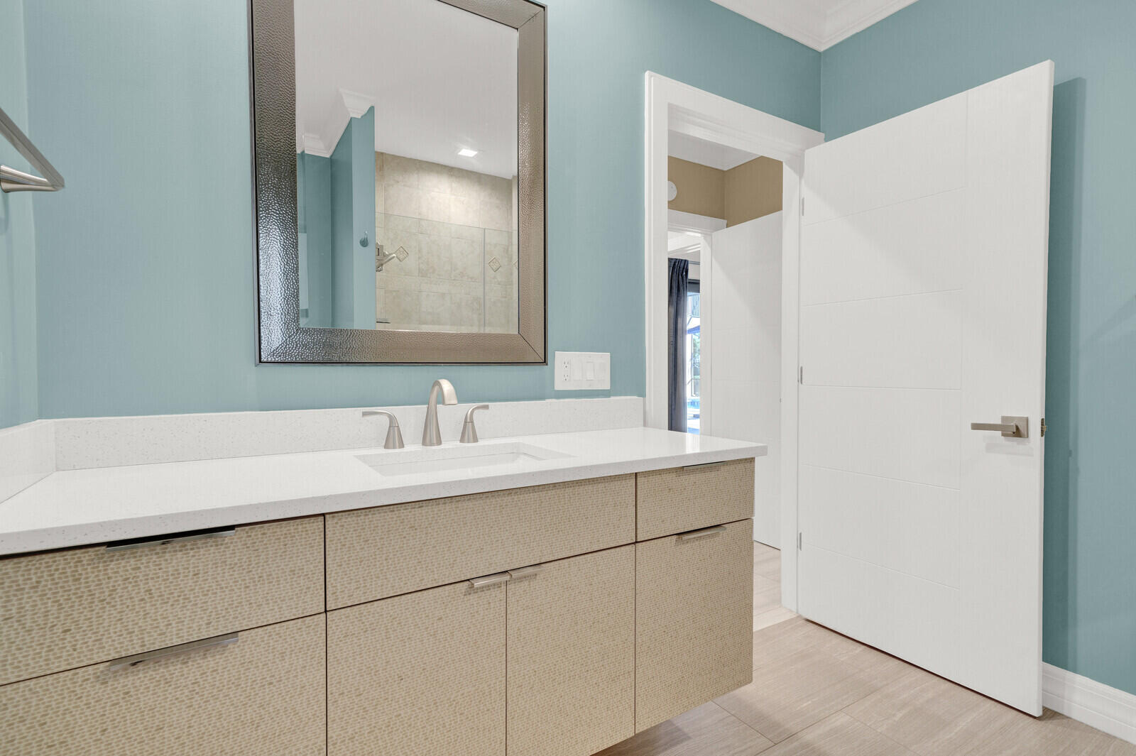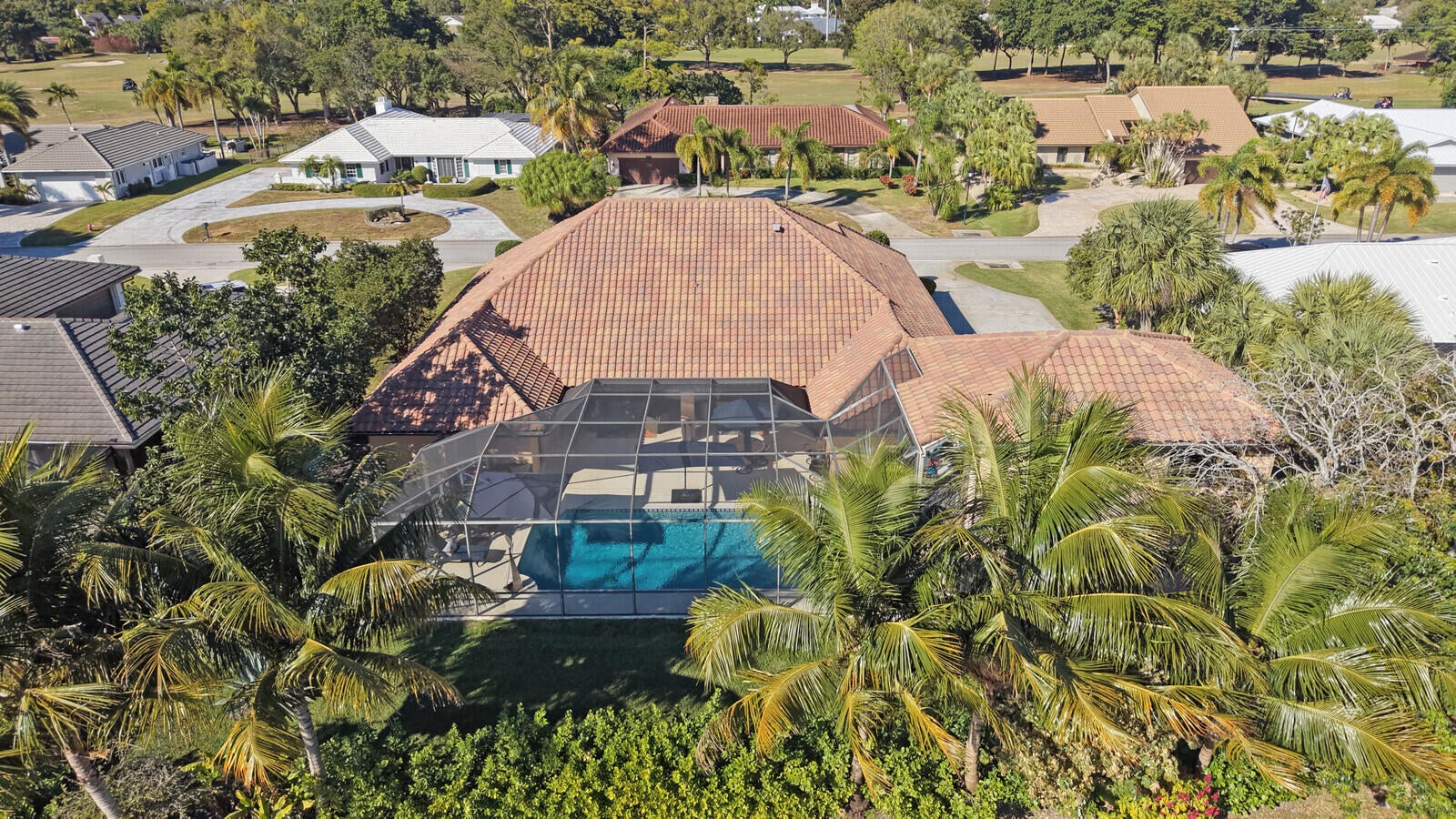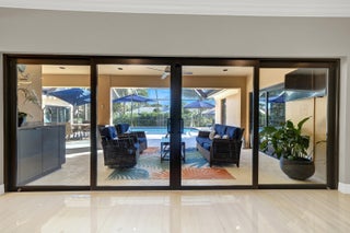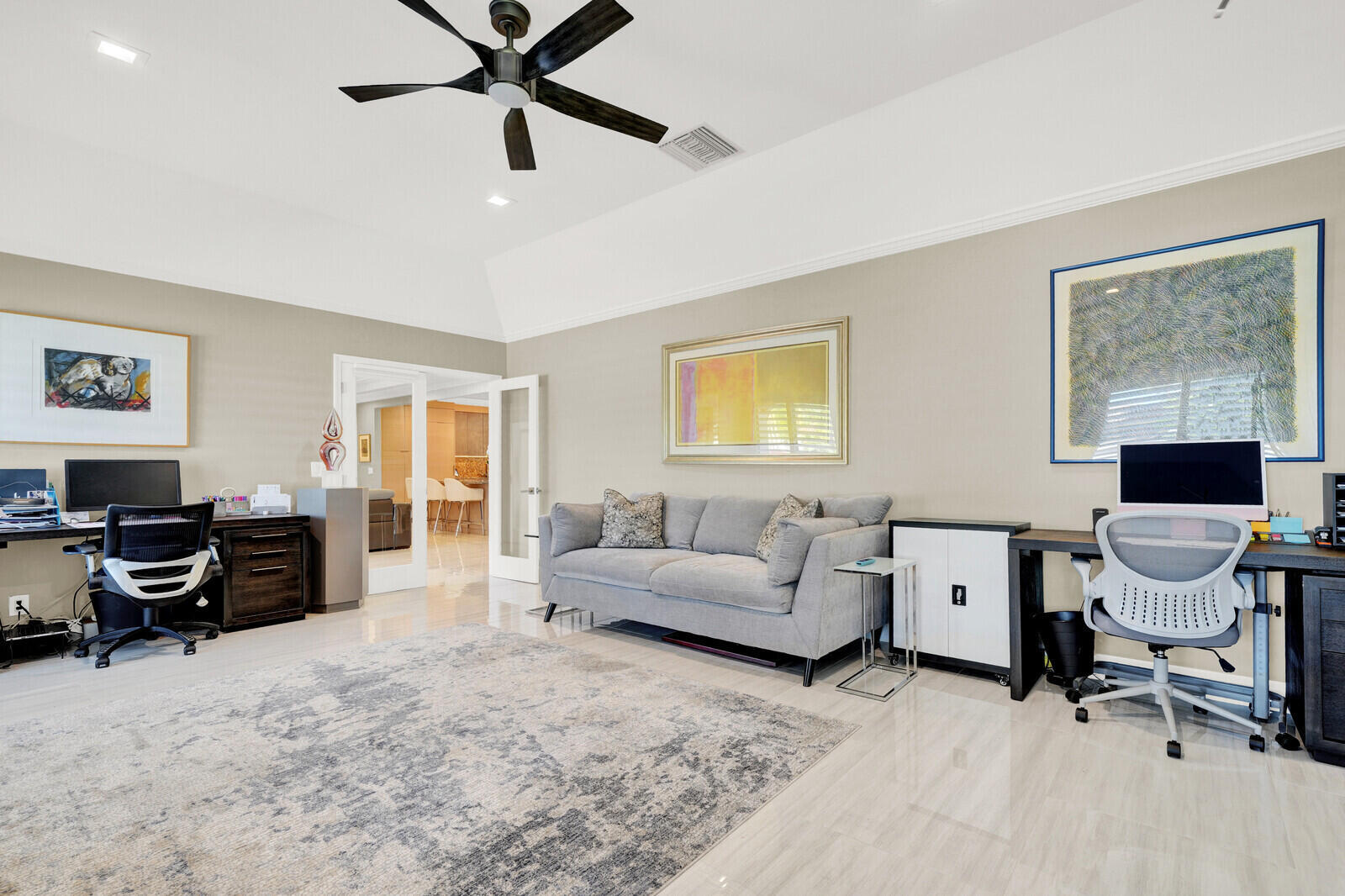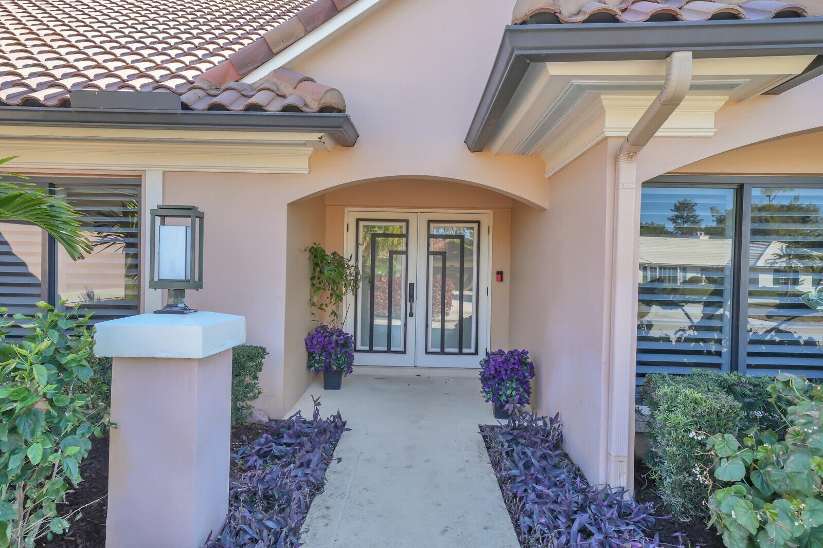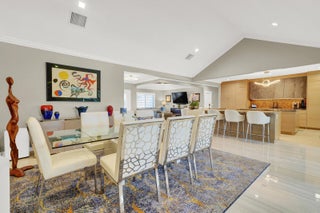 Exceptional pool home with a private guest house in the City of Atlantis, offering a rare blend of privacy, flexibility, and thoughtful design. Situated on an approximately 0.38-acre canal-front lot, this distinctive property features a 3-bedroom, 3 full and 2 half bath main residence with 3,187 square feet under air, along with a two-story guest house offering 2 bedrooms, 1 full bath, and 1,092 square feet under air, for a total living area of 4,279 square feet. The layout is ideal for multigenerational living, extended guests, or a private retreat that is seamlessly connected yet easily independent.Both the main home and guest house are oriented toward the screen-enclosed pool and covered patio, creating an effortless indoor-outdoor lifestyle. A lush Calusia hedge providesexceptional privacy, while the canal setting offers a tranquil backdrop. Curb appeal is enhanced by a circular driveway and covered front entry, with an additional side driveway leading to a discreetly positioned 2.5-car garage tucked out of view from the street. The expanded garage includes a two-car bay, dedicated golf cart storage with interior access, built-in cabinetry, and additional storage space. The main residence features a split floor plan offering privacy and flexibility, including one ensuite guest bedroom and a second guest bedroom accessed by a private hallway that can be enclosed for a suite-style configuration. Vaulted and volume ceilings are found throughout, including approximately 15-foot ceilings in the dining room and 14-foot tray ceilings in the family room, primary suite, and bonus room. The bonus room provides versatile space for an office, gym, or den. Main living areas feature oversized ceramic tile flooring, while bedrooms are finished with luxury vinyl plank. Crown molding, baseboards, and plantation shutters enhance the interior, and impact windows and sliding glass doors are installed throughout the main home and guest house, with the exception of glass block in the primary bathroom. The custom-designed kitchen serves as the heart of the home, offering a seamless aesthetic with fully integrated appliances and custom wood cabinetry with soft-close doors and drawers. Highlights include a central island with induction cooktop, a Samsung smart oven with gourmet self-cook options, a fully paneled Dacor refrigerator and freezer, dual-zone wine and beverage refrigerator, and an expansive snack bar with seating for eight or more. Exceptionally planned storage includes spice drawers, dedicated cookware and sheet pan drawers, and a pantry. A pass-through window connects the kitchen to the covered patio and summer kitchen, enhancing entertaining. Matching cabinetry continues into the foyer powder room for a cohesive design. The primary suite features a 14-foot tray ceiling, direct access to the covered patio, and a spacious bathroom with dual vanities, a separate shower, and a soaking tub. Additional interior features include a large laundry room with utility sink, abundant storage, exterior access, and recently added Philips smart locks on multiple doors. The two-story guest house offers a private exterior entrance with smart lock and optional interior access from the pool area. The first floor includes a kitchenette, dining area, and family room, while the second floor features two bedrooms and a full bathroom. Luxury vinyl plank flooring runs throughout, with carpeted stairs only. One bedroom enjoys a private balcony overlooking the pool and canal, and impact windows and sliders are installed throughout. Outdoor living is highlighted by a screen-enclosed pool with covered patio, outdoor shower, and a true cabana bath accessible directly from the pool deck. Additional usable yard space exists beyond the screened enclosure, and a natural gas line remains in place for a future pool heater and other appliances as desired. The home is equipped with extensive systems and smart features, including three air conditioning systems with Ecobee smart thermostats, three water heaters including two tankless units, a whole-house generator with load-shedding switches, central vacuum system, whole-house gutters, and natural gas service. Located within the fully gated City of Atlantis, residents enjoy three manned guard gates, an independent police department, two golf courses, and a vibrant calendar of community events. This rare offering combines privacy, versatility, and modern systems in a thoughtfully designed layout, delivering exceptional indoor-outdoor living in one of Palm Beach County's most distinctive communities.