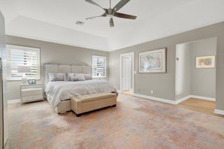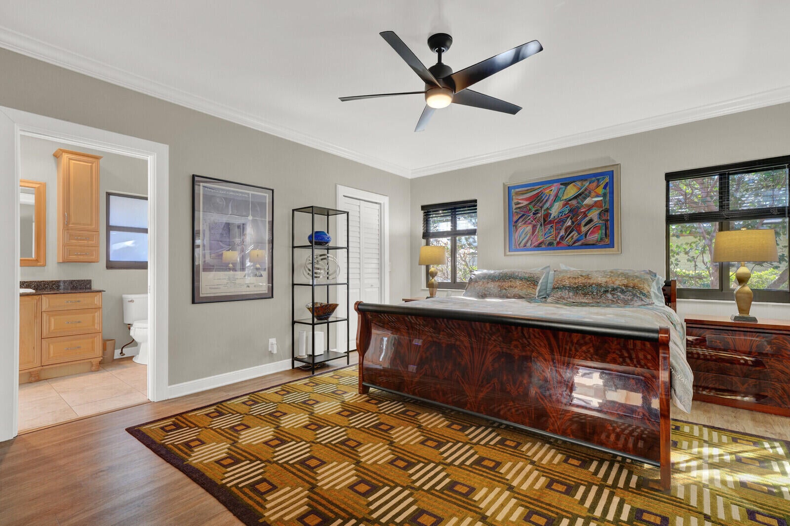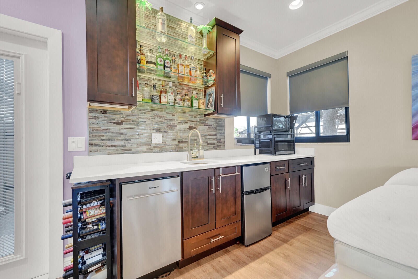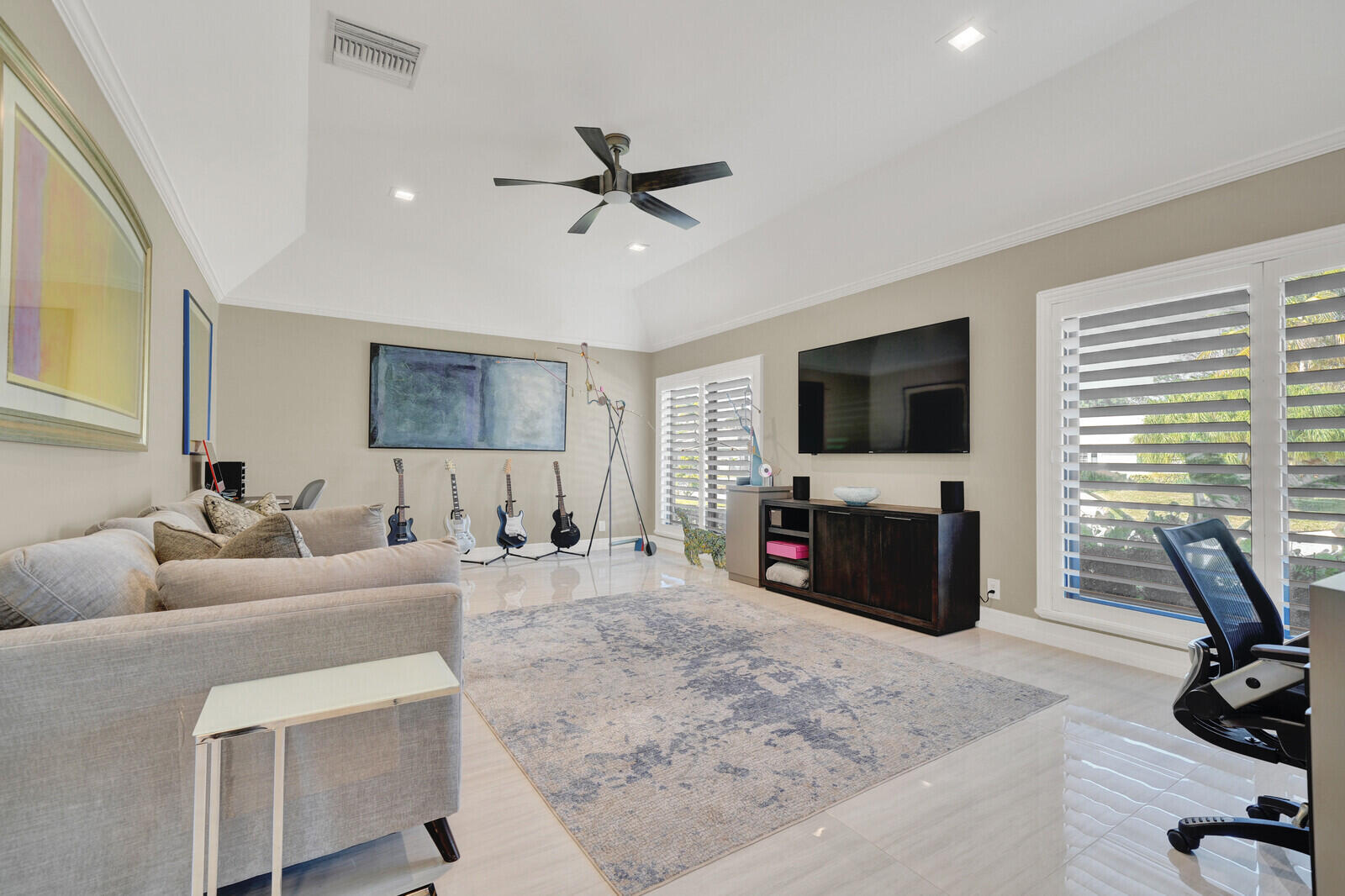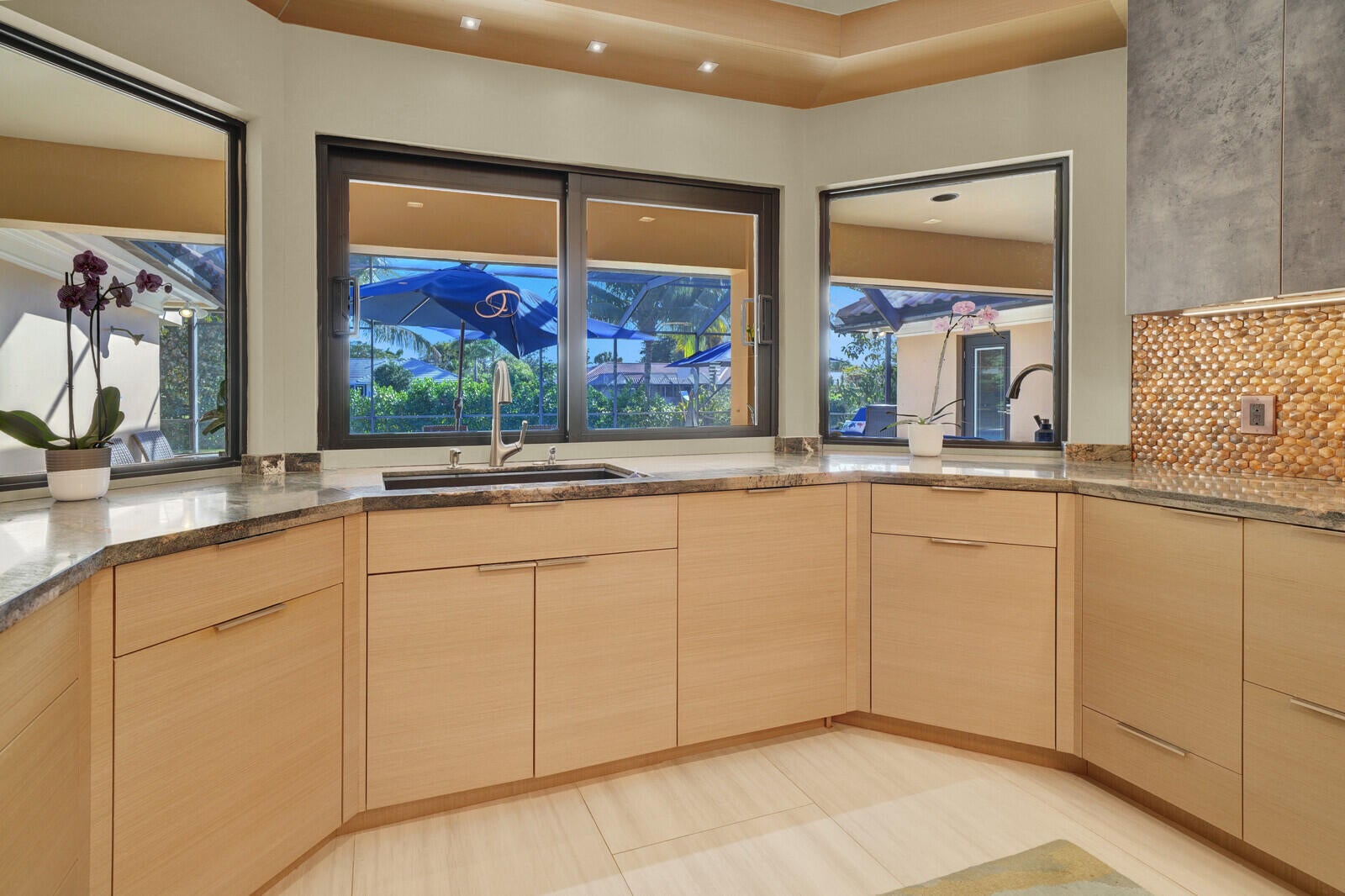 Exceptional pool home with a private guest house in the City of Atlantis, offering a rare blend of privacy, flexibility, and thoughtful design. Situated on an approximately 0.38-acre canal-front lot, this distinctive property features a 3-bedroom, 3 full and 2 half bath main residence with 3,187 square feet under air, along with a two-story guest house offering 2 bedrooms, 1 full bath, and 1,092 square feet under air, for a total living area of 4,279 square feet. The layout is ideal for multigenerational living, extended guests, or a private retreat that is seamlessly connected yet easily independent.Both the main home and guest house are oriented toward the screen-enclosed pool and covered patio, creating an effortless indoor-outdoor lifestyle. A lush Calusia hedge providesexceptional privacy, while the canal setting offers a tranquil backdrop. Curb appeal is enhanced by a circular driveway and covered front entry, with an additional side driveway leading to a discreetly positioned 2.5-car garage tucked out of view from the street. The expanded garage includes a two-car bay, dedicated golf cart storage with interior access, built-in cabinetry, and additional storage space. The main residence features a split floor plan offering privacy and flexibility, including one ensuite guest bedroom and a second guest bedroom accessed by a private hallway that can be enclosed for a suite-style configuration. Vaulted and volume ceilings are found throughout, including approximately 15-foot ceilings in the dining room and 14-foot tray ceilings in the family room, primary suite, and bonus room. The bonus room provides versatile space for an office, gym, or den. Main living areas feature oversized ceramic tile flooring, while bedrooms are finished with luxury vinyl plank. Crown molding, baseboards, and plantation shutters enhance the interior, and impact windows and sliding glass doors are installed throughout the main home and guest house, with the exception of glass block in the primary bathroom. The custom-designed kitchen serves as the heart of the home, offering a seamless aesthetic with fully integrated appliances and custom wood cabinetry with soft-close doors and drawers. Highlights include a central island with induction cooktop, a Samsung smart oven with gourmet self-cook options, a fully paneled Dacor refrigerator and freezer, dual-zone wine and beverage refrigerator, and an expansive snack bar with seating for eight or more. Exceptionally planned storage includes spice drawers, dedicated cookware and sheet pan drawers, and a pantry. A pass-through window connects the kitchen to the covered patio and summer kitchen, enhancing entertaining. Matching cabinetry continues into the foyer powder room for a cohesive design. The primary suite features a 14-foot tray ceiling, direct access to the covered patio, and a spacious bathroom with dual vanities, a separate shower, and a soaking tub. Additional interior features include a large laundry room with utility sink, abundant storage, exterior access, and recently added Philips smart locks on multiple doors. The two-story guest house offers a private exterior entrance with smart lock and optional interior access from the pool area. The first floor includes a kitchenette, dining area, and family room, while the second floor features two bedrooms and a full bathroom. Luxury vinyl plank flooring runs throughout, with carpeted stairs only. One bedroom enjoys a private balcony overlooking the pool and canal, and impact windows and sliders are installed throughout. Outdoor living is highlighted by a screen-enclosed pool with covered patio, outdoor shower, and a true cabana bath accessible directly from the pool deck. Additional usable yard space exists beyond the screened enclosure, and a natural gas line remains in place for a future pool heater and other appliances as desired. The home is equipped with extensive systems and smart features, including three air conditioning systems with Ecobee smart thermostats, three water heaters including two tankless units, a whole-house generator with load-shedding switches, central vacuum system, whole-house gutters, and natural gas service. Located within the fully gated City of Atlantis, residents enjoy three manned guard gates, an independent police department, two golf courses, and a vibrant calendar of community events. This rare offering combines privacy, versatility, and modern systems in a thoughtfully designed layout, delivering exceptional indoor-outdoor living in one of Palm Beach County's most distinctive communities.