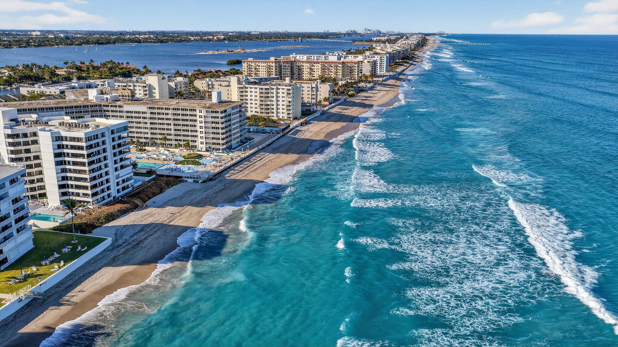 Exceptional Value. Elevated Coastal Living. Complete Peace of Mind! Enjoy this corner residence at Mayfair House -- where all major building work is done: Structural Integrity and Reserve Study completed, concrete restoration finished, plumbing updated, brand-new elevators, fully funded reserves, no assessments and approved for financing. This expansive 1,541 sq. ft. two-bedroom corner unit is favored for its natural light, privacy and stunning sunset views. Large windows and Sliders surround the expansive living area, creating a bright, open space perfect for both entertaining and everyday comfort. Travertine floors, impact windows and shutters, fresh paint, updated baths, and generous storage complete the package.The split floor plan offers ideal separation, with a spacious primary suite featuring patio access, a walk-in closet and an updated ensuite bath. Granite countertops and wood cabinetry enhance the kitchen's timeless appeal. Residents enjoy refreshed grounds, pool, fitness room, deeded beach access and 24/7 manned front desk all in the heart of South Palm Beach, a walker's and cyclist's paradise. Just steps to Plaza Del Mar (Publix, boutiques, dining) and across from the renowned Eau Spa. Only 20 minutes to Palm Beach International Airport. This isn't just a condo it's effortless coastal living at an exceptional price.