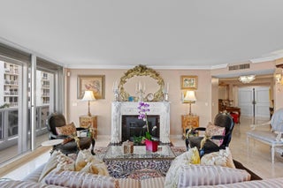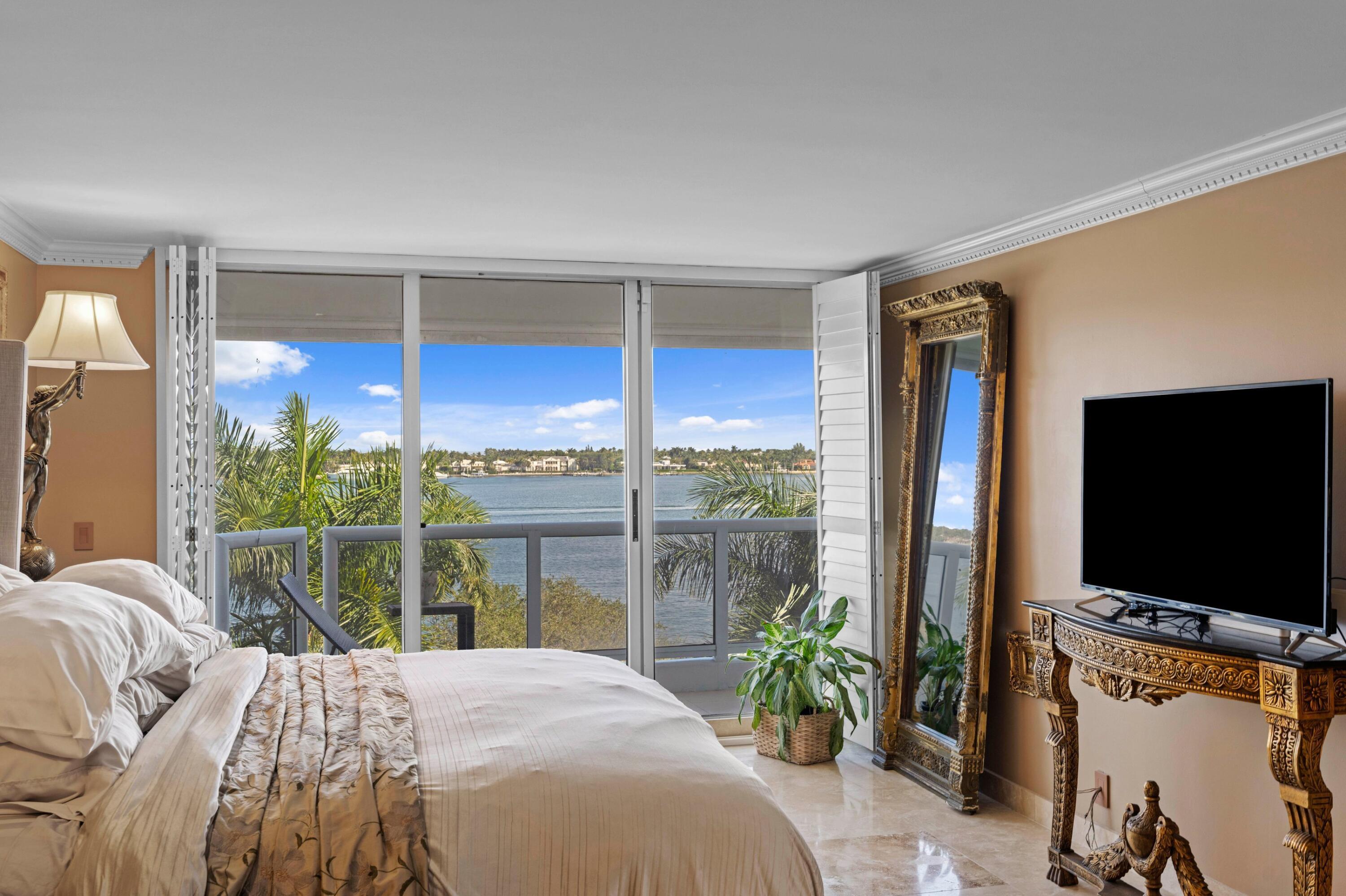 A rare opportunity awaits in Villa Del Lago's with this renovated 3-bedroom unit. The building's design features two units per floor, accessible via a semi-private elevator vestibule that opens into a spacious foyer. With 2,080 +/- square feet, this condo boasts an open floor plan and split bedroom layout, complemented by expansive glass sliding doors that lead to a glass-railed wraparound balcony offering breathtaking views of Lake Worth Intracoastal waterway, Palm Beach Island, and the ocean. Refined touches throughout include marble flooring, decorator lighting, and crown moldings. The gourmet kitchen features high-end appliances, granite counters, and backsplashes. The primary bedroom suite is a serene retreat with a spa-inspired bathroom, dual vanities, high-end fixtures, stone countcustom cabinets, custom sinks, a marble dual shower, and a large custom closet. Two guest bedrooms, a laundry room, and additional storage complete the floor plan. Residents enjoy garage parking for two cars, an additional storage locker, and access to the building's amenities, including two sundecks with pools, saunas, a covered outdoor dining loggia with barbecue facilities, and lush garden terraces, Dog run and more...
