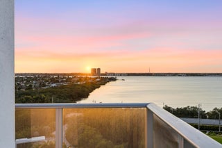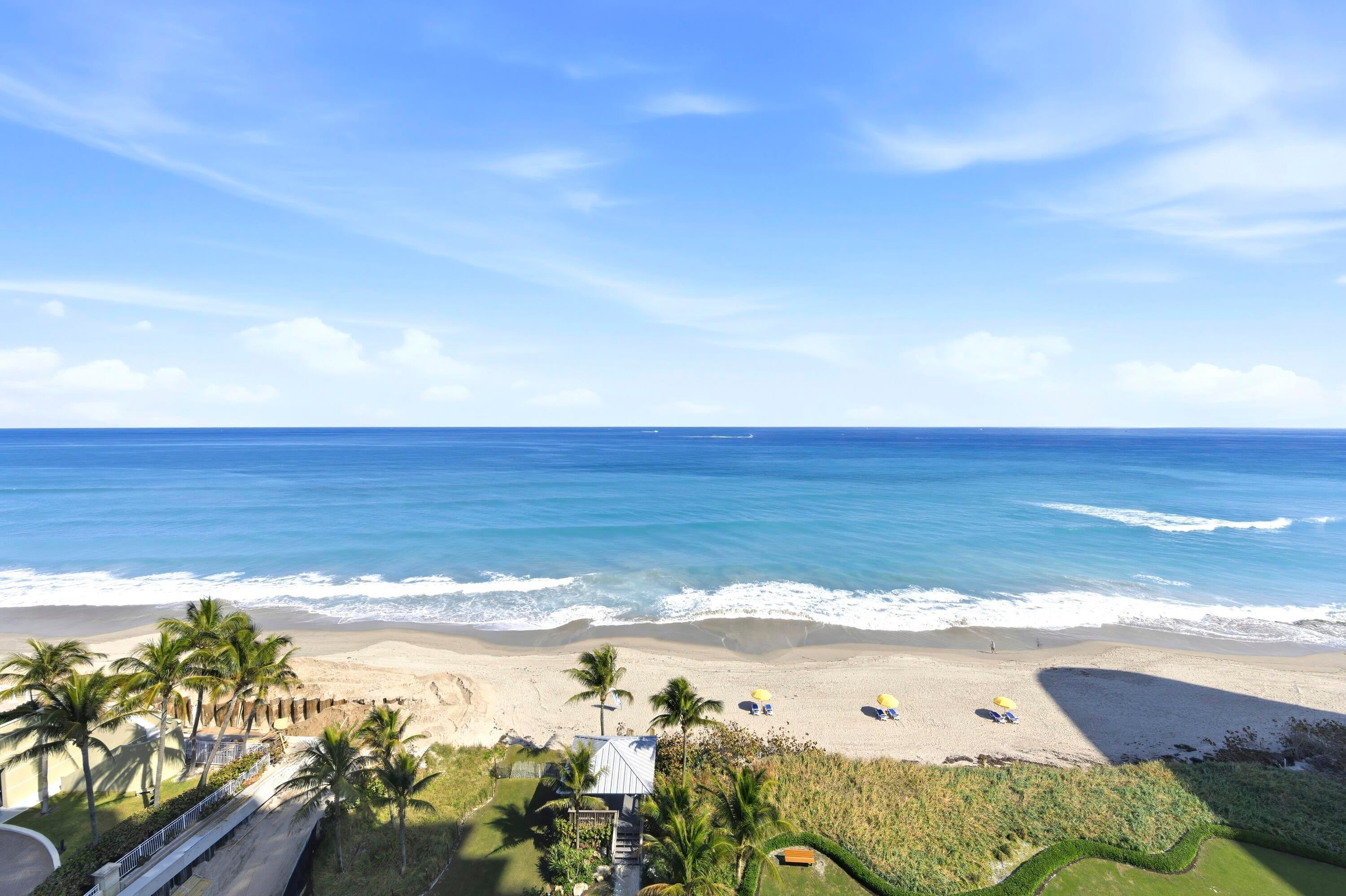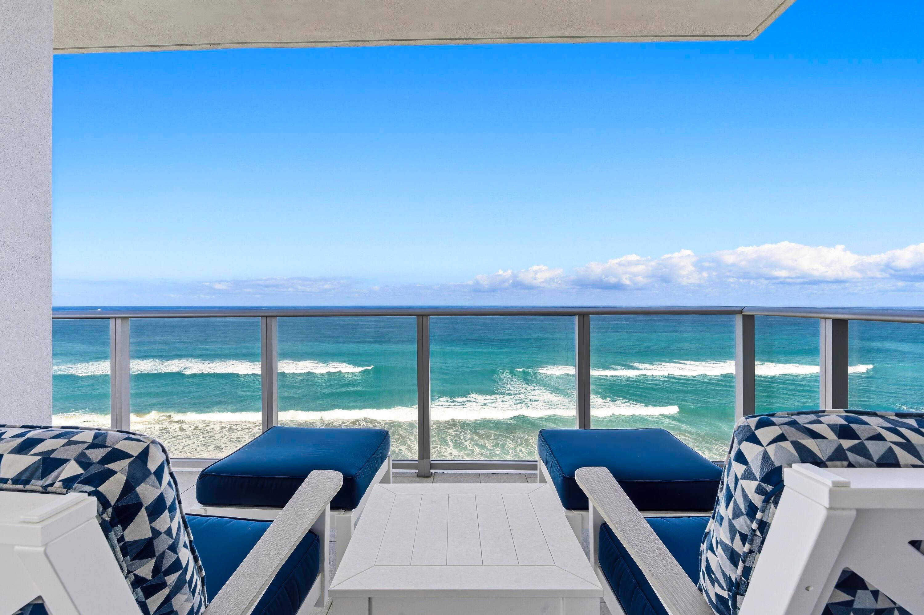 Rising above more than 340 feet of pristine private beachfront, Residence 1001 at 5000 NorthOcean is a fully customized oceanfront residence where architectural scale, refined craftsmanship, and panoramic water views converge.This coveted Seabreeze-model residence commands sweeping Atlantic Ocean and Intracoastal vistas through expansive walls of floor-to-ceiling glass, with generous balconies designed for true indoor-outdoor living. Arrival is via a private elevator foyer, offering privacy and scale more commonly associated with a single-family estate than a condominium. The interior has been extensively upgraded, well beyond original specifications. Large-format polished porcelain flooring flows throughout the home, complemented by custom wood trim and tailored detailing that adds warmth and structure to the contemporary design. The residence balances clean modern lines with carefully executed architectural craftsmanship. The kitchen serves as both a visual centerpiece and a functional workspace, featuring an Azul Macaubus quartzite social island with dramatic waterfall edges, white quartzite countertops and a full-height coordinating tumbled glass backsplash. A complete Thermador appliance suite, integrated lighting, upgraded fixtures, and the generously proportioned social island support both daily living and entertaining. Upgraded cabinetry and refined finishes maintain a seamless connection to the adjoining living areas. Entertaining spaces are thoughtfully designed and highly customized. The elegant great room opens to the spacious wrap-around balcony, offering breath-taking views of both the ocean and intracoastal waterway. The game/media room features an exquisite custom wet bar with waterfall edge finished in a stunning semi-precious stone that complements the custom cabinetry with display storage; paired refrigeration; stainless steel accents; and integrated lighting. The wet bar countertop was selected with intent to coordinate with the kitchen island to enhance design cohesion. Lighting throughout the residence has been intentionally curated, incorporating sculptural chandeliers, designer pendants, recessed architectural lighting, and upgraded ceiling fixtures that define each space with clarity and balance. The primary suite offers balcony access and expansive ocean and intracoastal views. It includes custom-designed closet systems and a refined spa-style bath appointed with large-format porcelain wall and floor tile, floating dual vanities with integrated storage and stone countertops selected for durability and visual continuity. A freestanding soaking tub serves as a sculptural focal point, while the glass-enclosed shower features bench seating, recessed niches, and upgraded fixtures designed for both comfort and performance. Backlit mirrors, full-height custom glass wall tile, tailored cabinetry, and curated hardware selections complete the space, creating a bath that feels architectural, calm, and deliberately understated. Guest bedrooms and secondary living spaces continue the same level of finish, with custom trim detailing, integrated lighting, motorized window treatments, and cohesive material selections throughout. A well-appointed powder room features designer wall coverings, modern fixtures, and custom cabinetry. Additional enhancements include sun-protection film on all exposures, electrical and lighting upgrades, custom closet interiors, and discreet entry detailing for improved sound and light control. Designed by Randall Stofft Architects, 5000 North Ocean is a 19-story oceanfront landmark set across 4.5 acres of preserved dunes and natural habitat. Residents enjoy a private beach sanctuary, oceanfront pool, state-of-the-art fitness center overlooking the Atlantic, resident club room, concierge services, valet parking, and a 24-hour attended security. Located just minutes from Palm Beach International airport, Worth Avenue, championship golf, tennis, and world-class dining, Residence 1001 presents a rare opportunity to acquire a fully customized, move-in-ready oceanfront home within Singer Island's newest and most exclusive address.