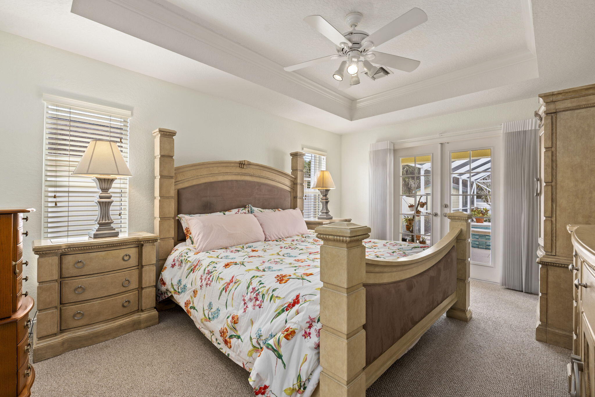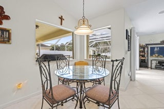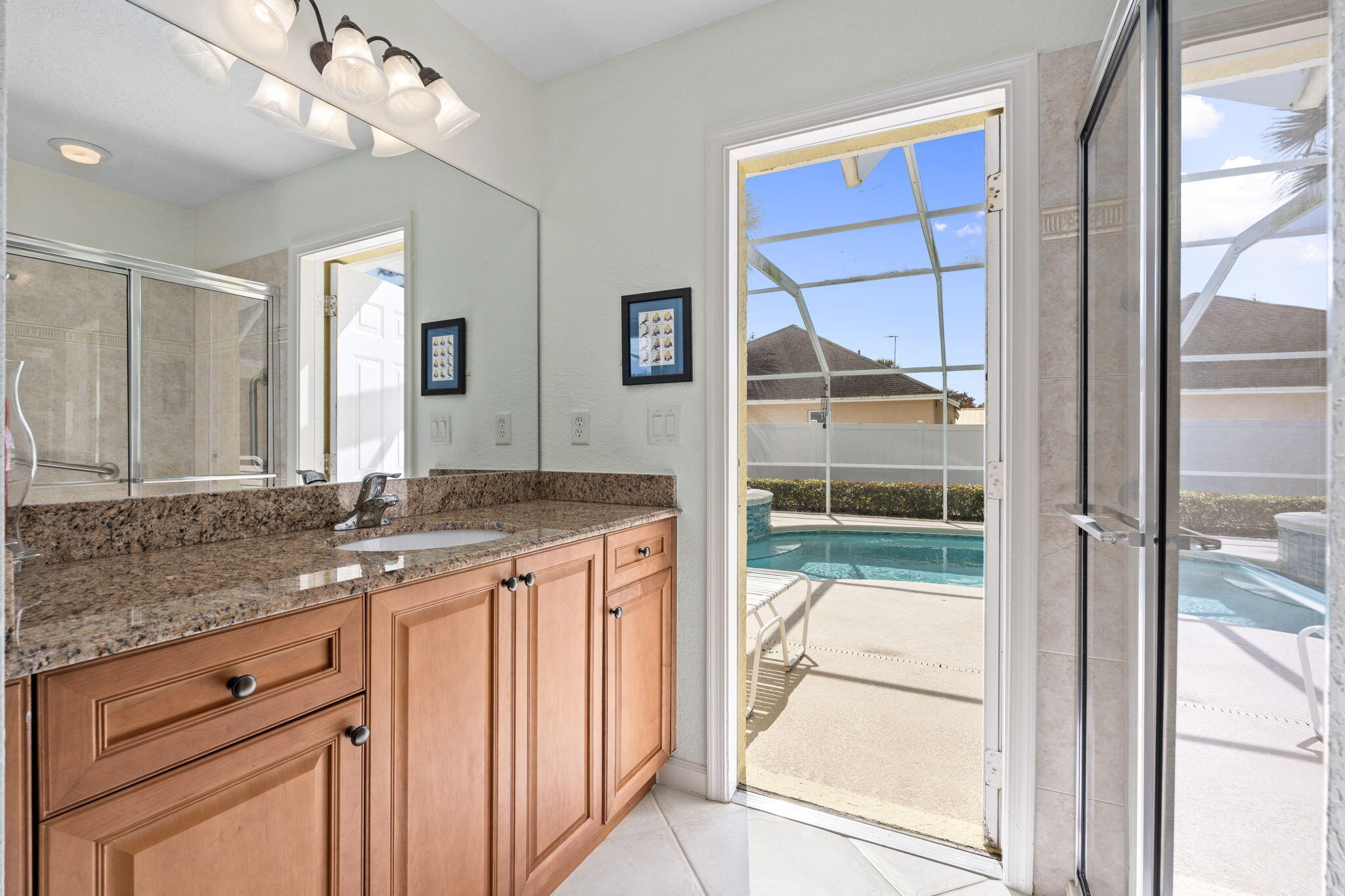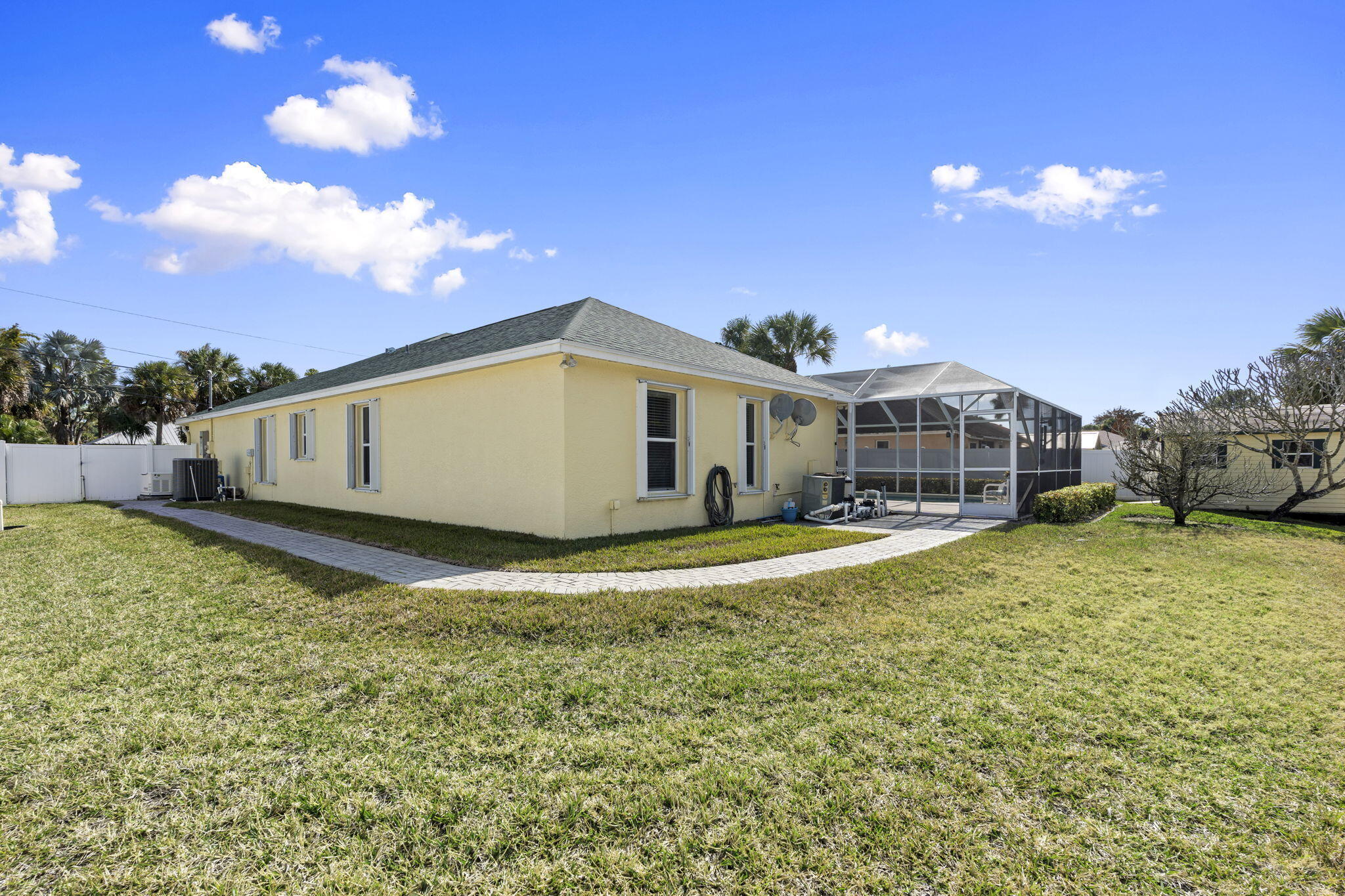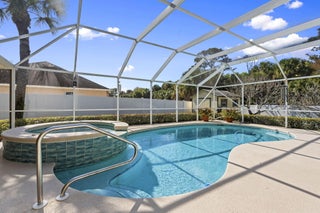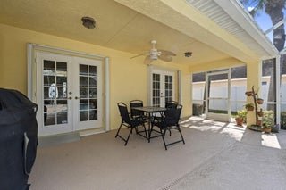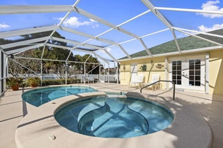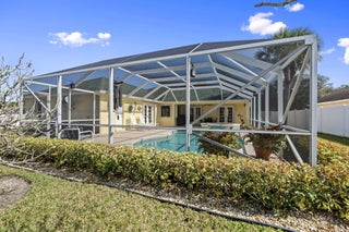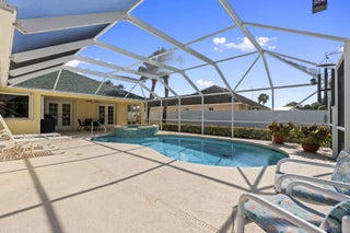 Welcome to this 4-bedroom, 3-bath corner lot pool home offering over 2,000 square feet of well-designed living space and the peace of mind buyers appreciate, a new roof (2024), AC (2021), water heater (2018), 22,000 kw generator, LeafFilter gutter guards and full accordion shutter protection. Inside, vaulted ceilings create an open, airy feel, complemented by granite countertops and a smart split floorplan that provides privacy between the primary suite and guest bedrooms. French doors from the formal dining room open to the lanai, enhancing the home's natural flow and connection to the outdoors. The primary suite offers direct pool access, dual walk-in closets, and separate vanities. Outdoors, the lifestyle takes center stage. A heated pool anchors the screened lanai, while a cabana bathadds convenience for guests. Enjoy a fully fenced yard for added privacy, a circular paver driveway framed by lush landscaping, and a powered shed perfect for storage or a workshop, all coming together to make this Florida property truly move-in ready.