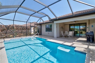 Who says you can't have your cake & eat it, too; this home HAS IT ALL! Lakefront, rarely available Classic Series Martin Ray floorplan; 2 bedrooms, 2 baths, flex room & golf cart garage; screened-in, gas heated salt water pool; a 22KW whole house generator w/ 500 gallon propane tank; phenomenally huge kitchen w/ JennAir 6 burner gas stove-top, quartz countertops, pull outs in your lower cabinets & walk-in pantry; plantation shutters, custom motorize interior shades & exterior awning. The Lakes is a quiet, friendly, well maintained & nicely landscaped community w/great amenities. A MUST SEE!