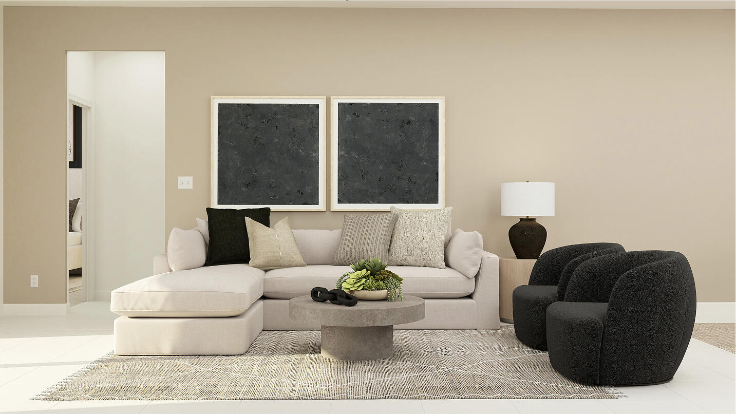 This new single-story home features a smart layout .Down the foyer is an open-plan design shared by the kitchen with a center island, dining room and family room, which extends out to the covered lanai. On the opposite side of the home are all three bedrooms to provide a restful retreat, including the owner's suite with an attached bathroom. At the front is a versatile two-car garage.Prices, dimensions and features may vary and are subject to change. Photos are for illustrative purposes only.