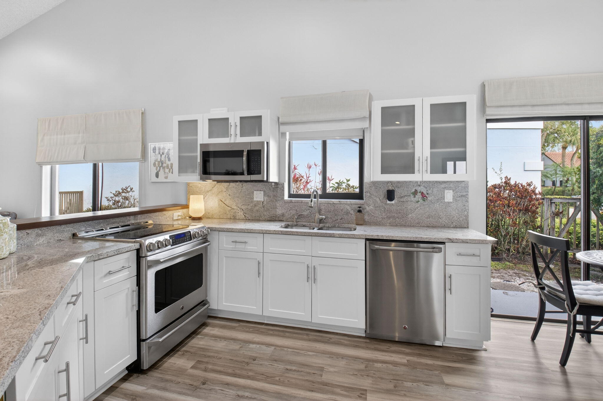 Welcome to 5536 Fox Hollow Drive -- a beautifully updated one-story lakefront retreat in the heart of Central Boca Raton.This light-filled 2-bedroom, 2-bath residence offers 1,585 total square feet of thoughtfully designed living space with a desirable split-bedroom layout and soaring cathedral ceilings that create an airy, expansive feel from the moment you enter.The redesigned kitchen is the heart of the home, featuring custom cabinetry, stainless steel appliances, and an inviting eat-in area with breakfast bar -- perfectly positioned to flow into the open living spaces. Elegant vinyl wood flooring runs throughout, adding warmth and continuity to the interior.Wake up and unwind to breathtaking lake views, with a generously sized backyard and side yard offering rare outdoor space.The screened-in patio provides the ideal setting for relaxing evenings, morning coffee, or effortless entertaining. Additional highlights include a 1.5-car garage with extra storage, plus a two-car driveway for added convenience. Ideally located just minutes from Boca Town Center Mall, top-rated dining, shopping, and every service imaginable -- this home combines tranquil waterfront living with unbeatable accessibility. A rare opportunity to enjoy serene lakefront living in one of Boca Raton's most sought-after central locations.