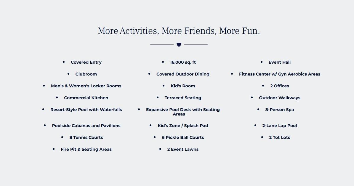 View Virtual TourBusiness Center, Cabana, Cafe/Restaurant, Clubhouse, Community Room, Exercise Room, Fitness Trail, Game Room, Golf Course, Park, Pickleball, Playground, Pool, Sidewalks, Spa-Hot Tub, Street Lights, Tennis